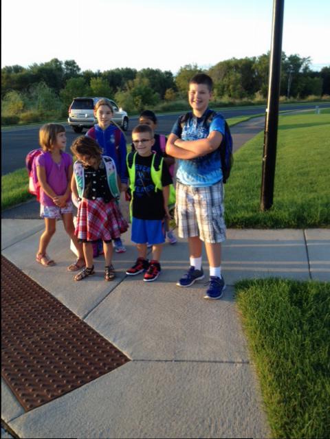 Lillan längst till vänster och Sonen längst till höger tillsammans med förväntansfulla kompisar i väntan på buss 369- som aldrig kom!