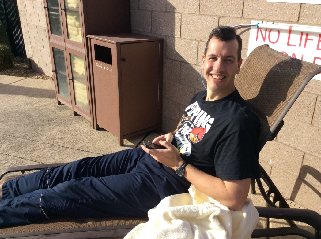 Länge höll barnen sig i vattnet också. Maken och jag turades om att sitta vid simabssängskanten, fast tungt att sitta där var det verkligen inte. Alltmedan solen steg på himlen och klockan tickade från nio till tolv, blev det varmare och varmare och naturligtvis också behagligare att sitta där i solstolen. I december…!