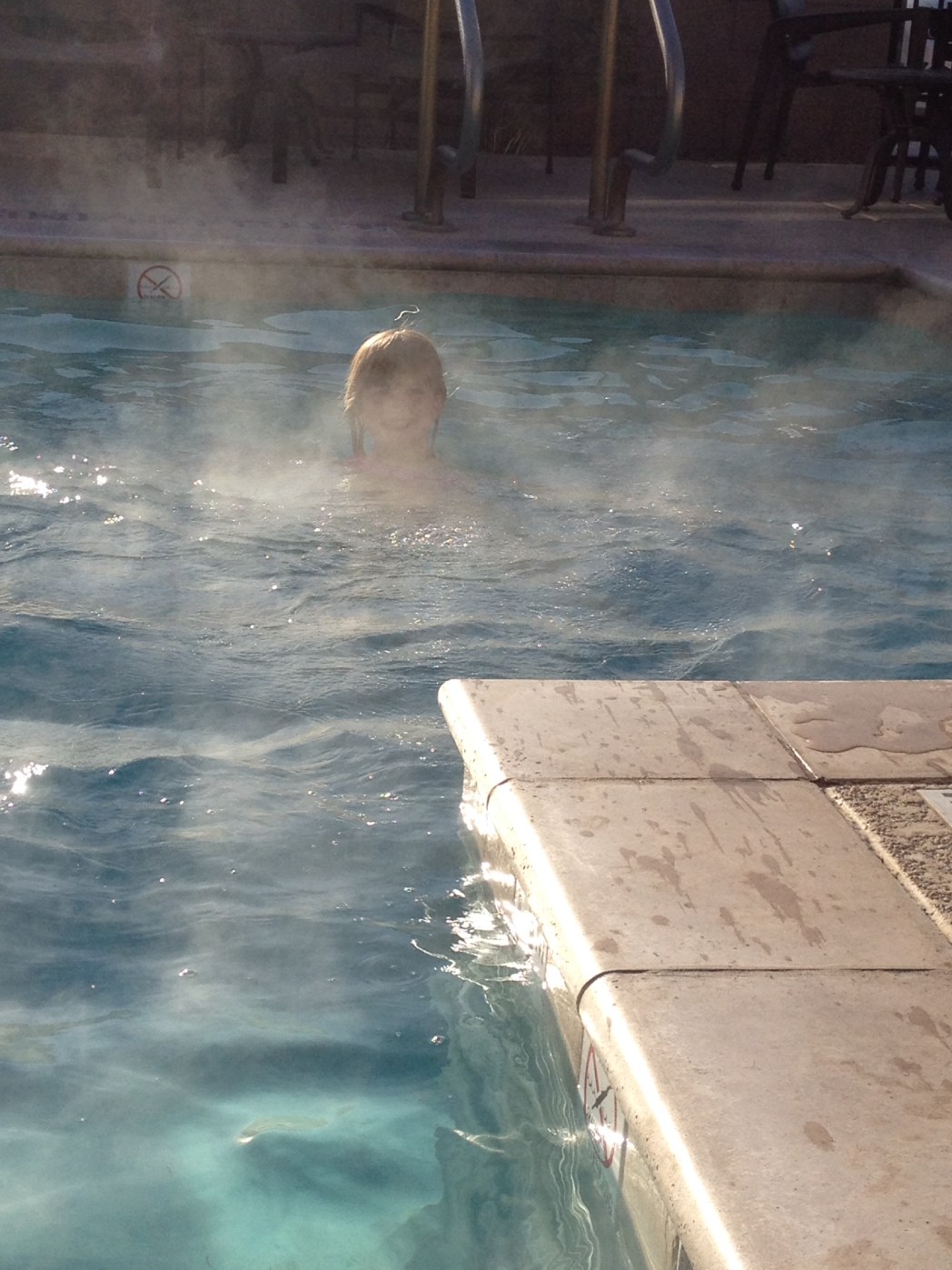 Lillan var den följande att ta sig ett dopp. Här syns också all ånga som steg upp i den kyliga luften från den uppvärmda simbassängen.
