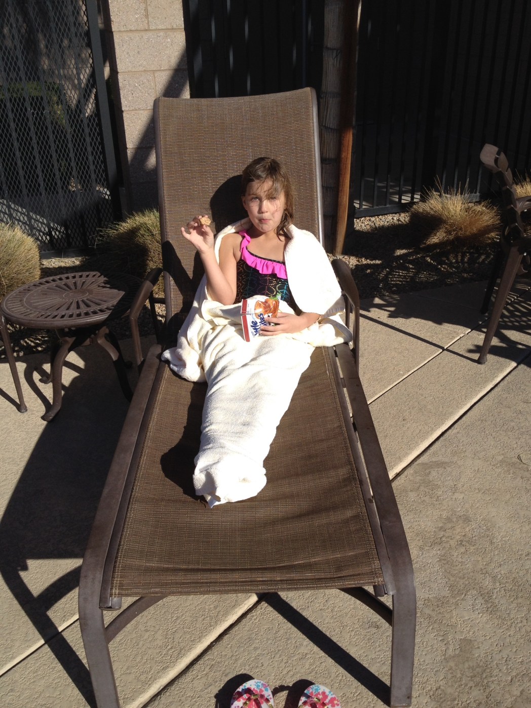 Ute vid hotellets simbassäng finns ett skåp försett med rena handdukar enkom för bruk för simmarna. Solen, som är mycket varm här på dessa breddgrader, även i början på januari, skiner in på dessa handdukar genom dörren på skåpet och de var varma och sköna att ta ut och linda omkring barnen med när de var klara med sitt simmande eller när det var dags att komma upp för ett snabbt mellanmål.
