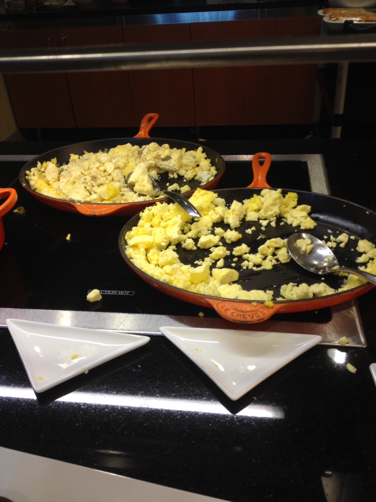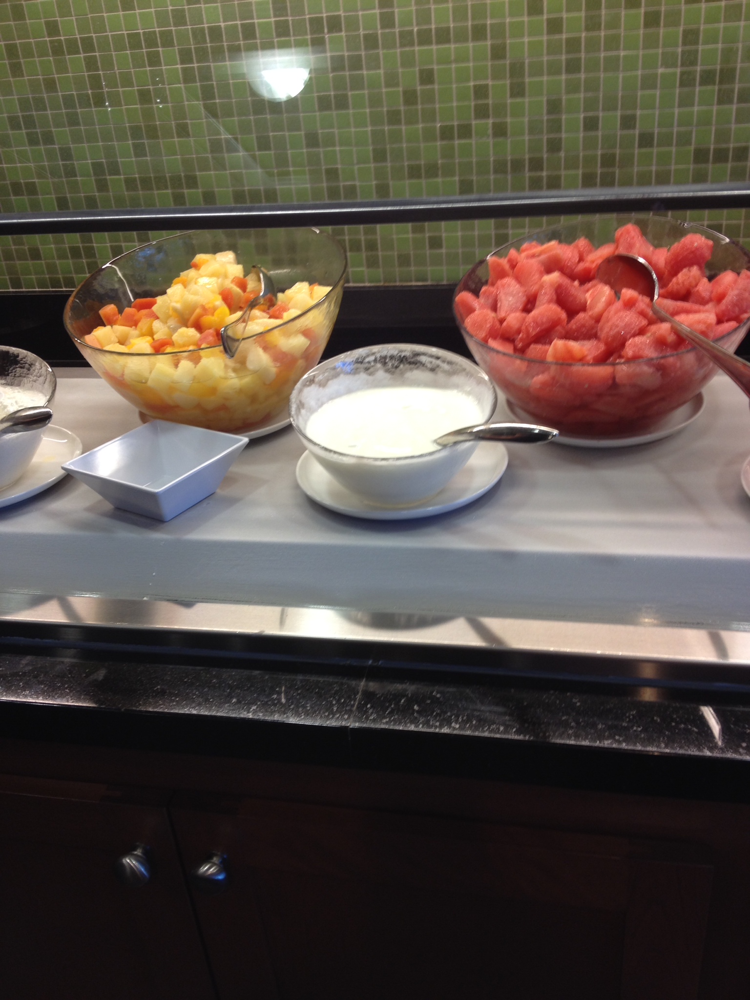 Detta morgonmål bestod dagligen av frukt, yogurt, grynost,olika äggrättter, amerikanska pannkakor, muffins, rostat bröd, kaffe, olika safter, mjölk och flingor! Bara att ta för sig och akta sig för att inte alldeles för mycket!