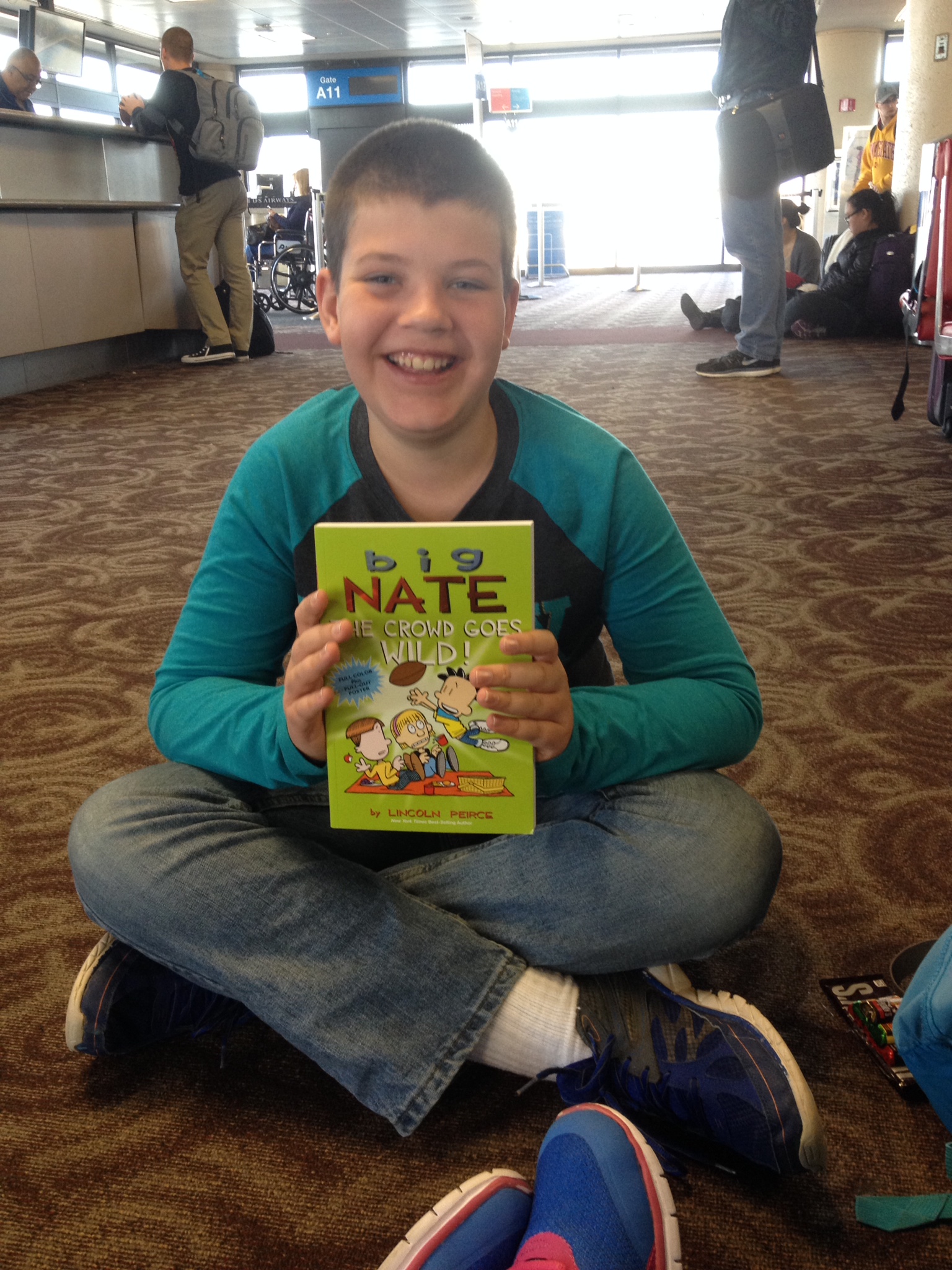 Efter lunchen hade vi endast en halv timme att vänta innan det var dags att gå ombord på planet. Sonen överraskades av en bok som han hade velat ha i julklapp när han hittade den i sin ryggväska. Hans faster hade nämligen köpt böcker åt barnen att ha under flygresan och jag hade smugglat ner den i hans väska utan att han visste om det. Han var mer än nöjd!