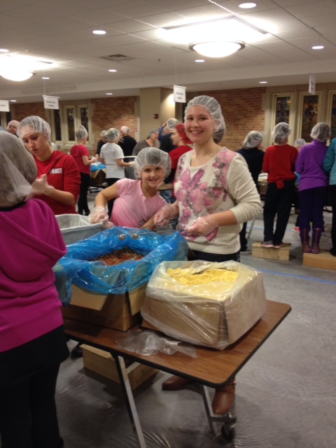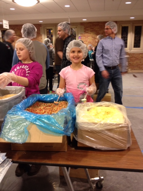 Ikväll jobbade vi hårt hela familjen. Det var dags för den årliga vecka då vår kyrka fyller påsar med kycklingbuljong, torkade grönsaker, soja och ris för att dessa sedan skall gå vidare till barn i olika delar av världen där det finns alldeles för lite mat och speciellt barnen svälter. De senaste fem åren har vår kyrka deltagit i detta projekt och frivilliga fyller påse efter påse med maten, sluter dem och packar dem i lådor. För fem år sedan fylldes hela fem miljoner påsar! Detta visade sig vara lite väl mycket, det skall ju betalas för också, vilket görs endast med penningdonationer av församlingsmedlemmarna. De senaste fyra åren har målet varit något lägre, 750 000 påsar skall fyllas inom loppet av sex veckor och detta skall ske endast med frivilliga krafter.