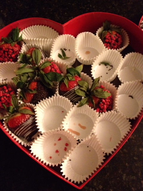 Åt svärföräldrarna hade jag köpt en vacker chokladask och den uppskattades minsann. maken fick kaffe, två sorter. Dock verkade kaffe inte riktigt vara tillräckligt när han kom med presenten som han hade hittat på åt mig…. En stor låda med chokladdoppade jordgubbar! Helt otroligt goda var de dessutom!