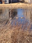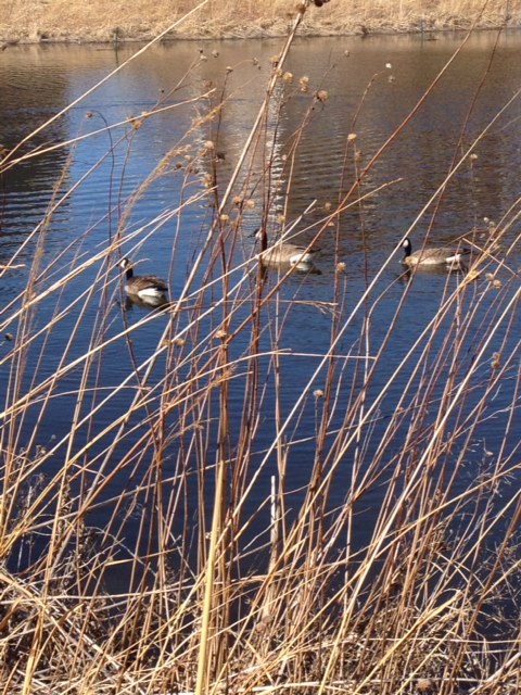 Kanadagässen är tillbaka och skränas på dammen. Vi har massor med gäss här på vårarna och höstarna, men under somrarna hålls de någon annanstans. Det värsta med dessa jättelika fåglar är att de kommer upp på gräsmattorna och sprider sina avföring överallt. Till all lycka är hunden Lilly väldigt bra på att hålla dem borta från både vår och grannarnas gräsmattor, det gäller bara att släppa ut henne så fort vi får en chans!