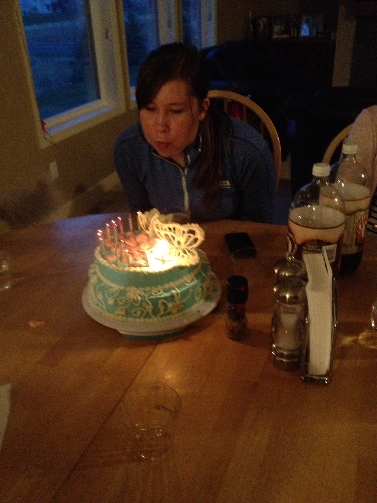 Det blev verkligen ett trevligt kalas! ja, du gissade rätt.Fjärilarna är gjorda av smält, vit choklad. Hon skrev ut ett mönster från nätet och ritade sedan av det på vaxpapper. Sedan smalt hon chokladen i mikro och ringlade den försiktigt ovanpå vaxpappret och mönstret. Hon lade dem sedan att stelna i en öppen bok, för att få vingarna att se ut som om de skulle flyga. Häftigt, eller hur?! Grädden på tårtan är ingen grädde, utan amerikansk, supersöt tårtglasyr som används ofta istället för grädde. Den färgade hon blå med hjälp av karamellfärg. Dottern gick en kurs i tårtdekoration förra sommaren… 🙂