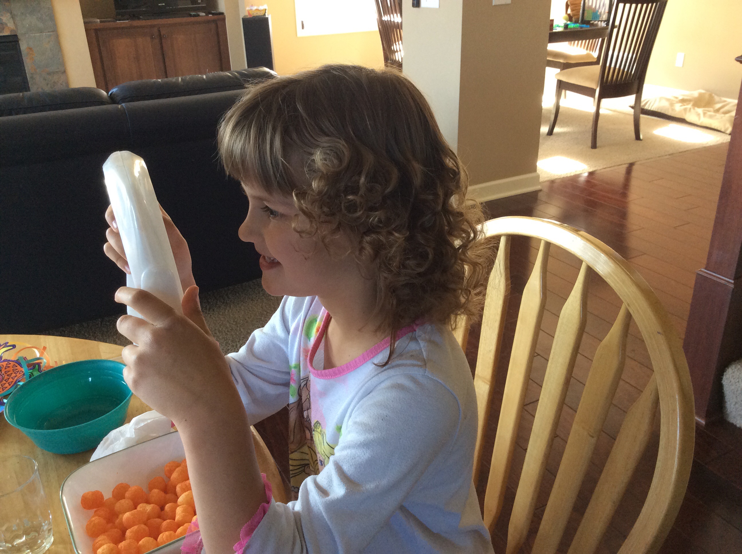 Redan kvällen före hade vi lagt rullat upp henens hår i gamla trasbitar. Hon hade sedan sovit i dessa för att sedan vakna med lockigt hår på lördag morgon. Nu är det så att Lillasysters hår är så spikrakt som deet bara kan bli, så efter att vi tagit ut dessa trasbitar och lagt en massa hårskum i hennes hår, började lockarna redan komma ut! Men, men, tydligen finnns det ngn oskriven regel någonstans där det står att dansande flickor i ålder 3-10 skall ha lockar i håret då de uppträder.