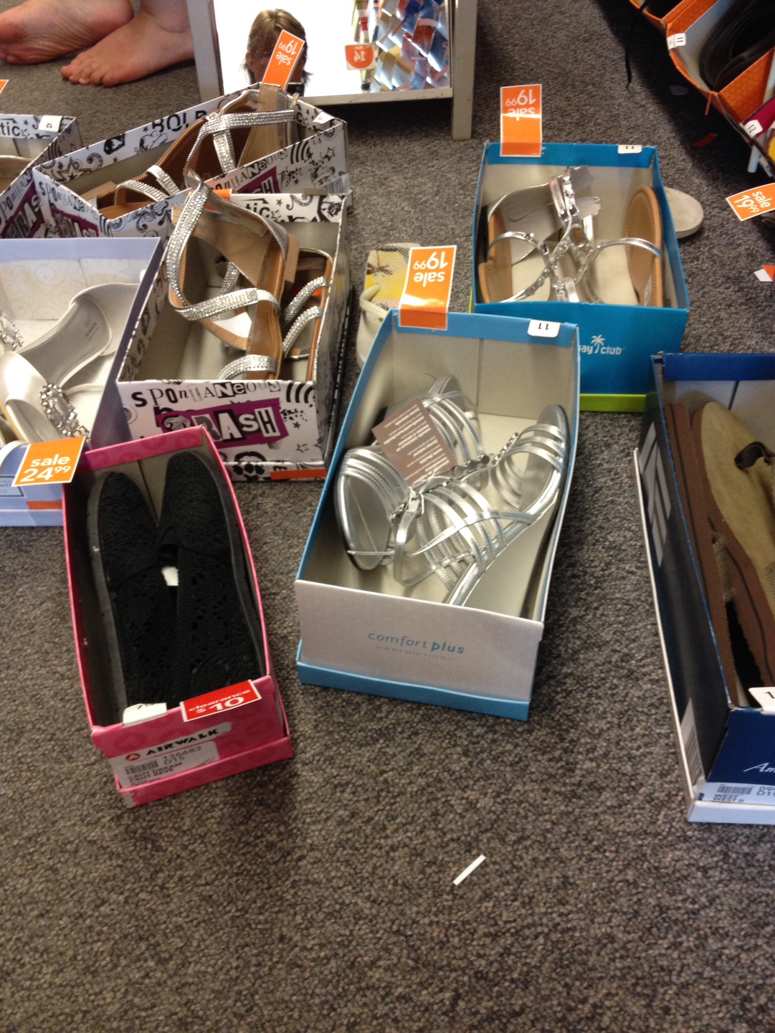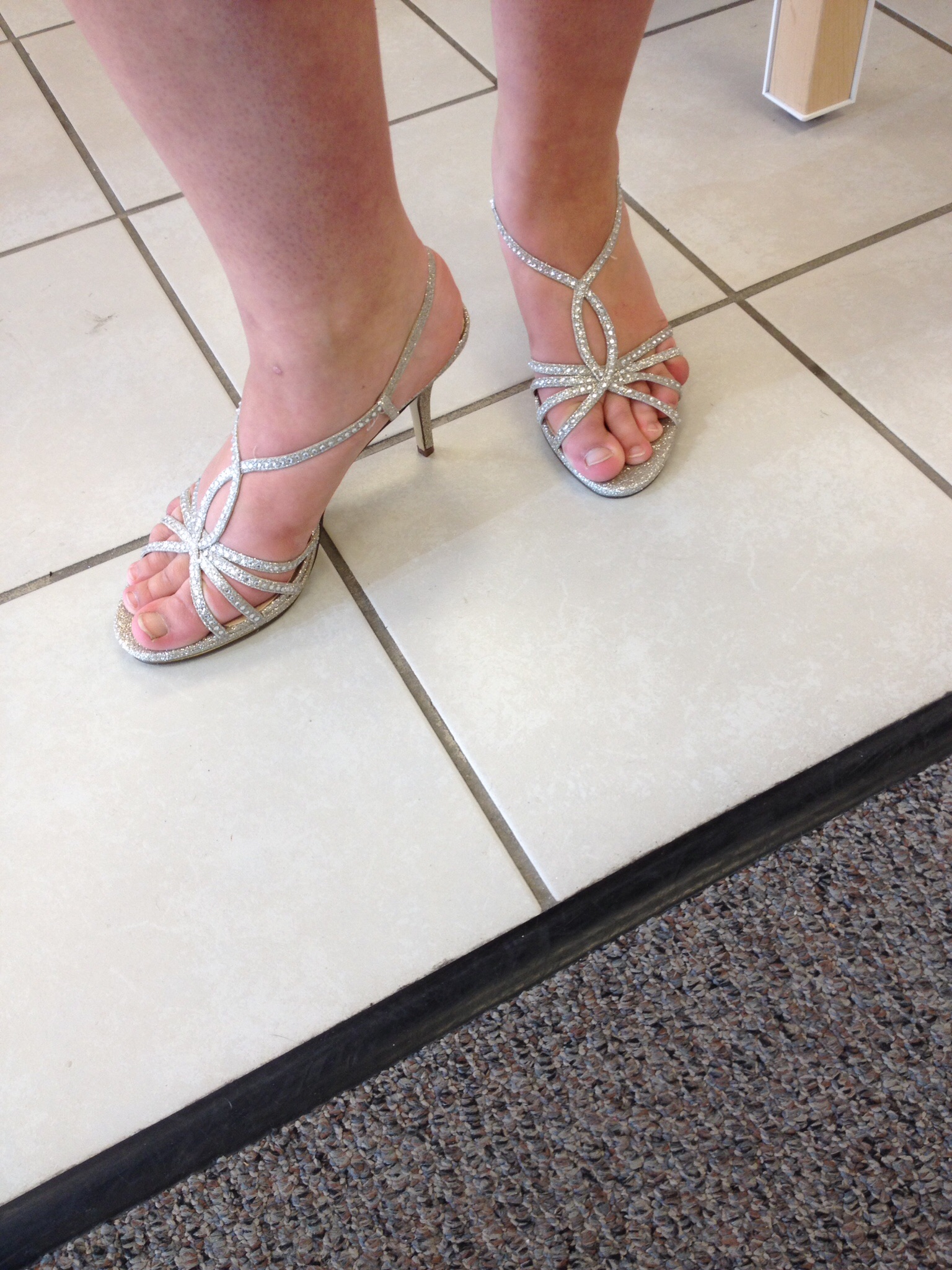Par nummer 1 som Dottern provade hade en liten klack och var sliverfärgade. Söta, lite finare sandaler, men som såg nästan för små ut på henne…
