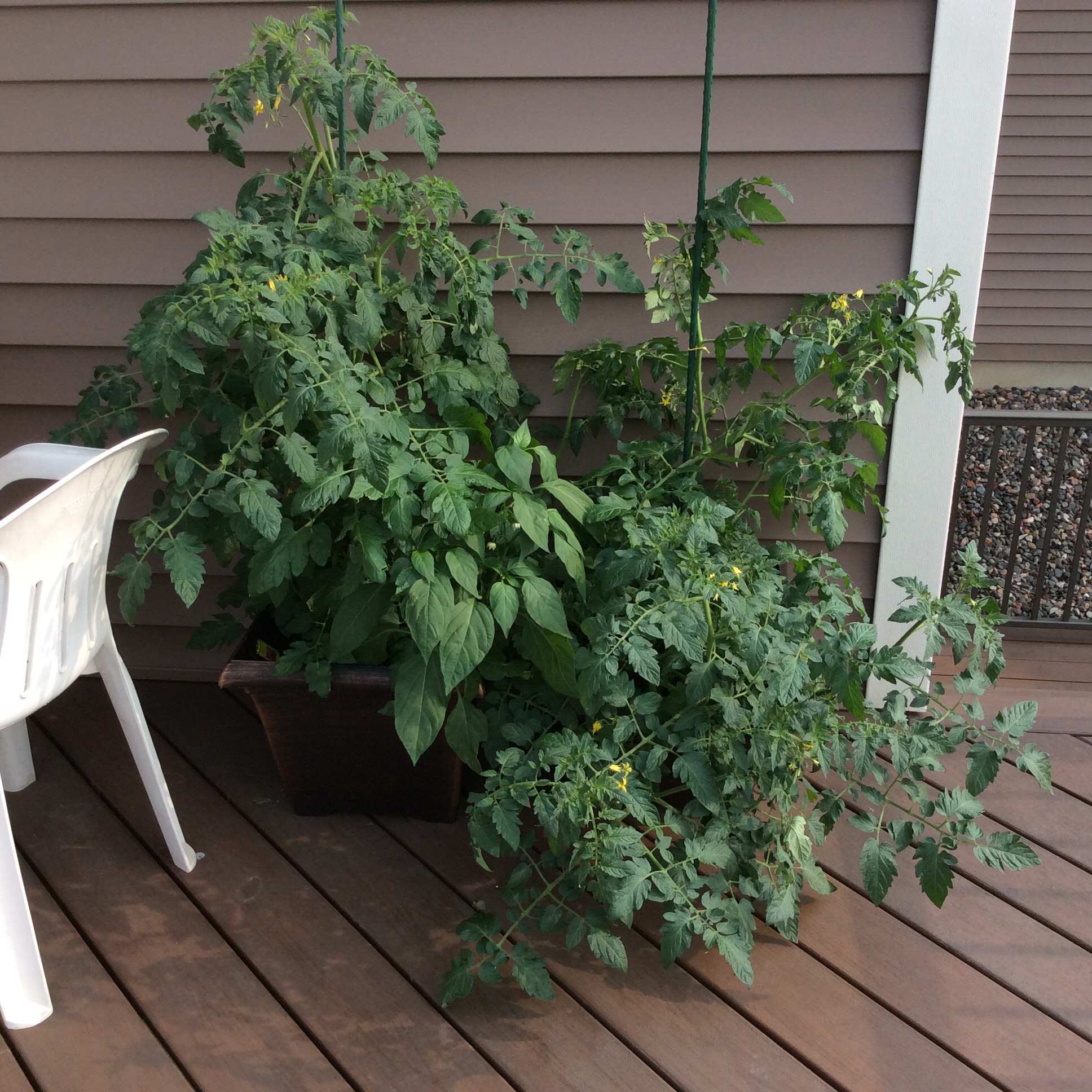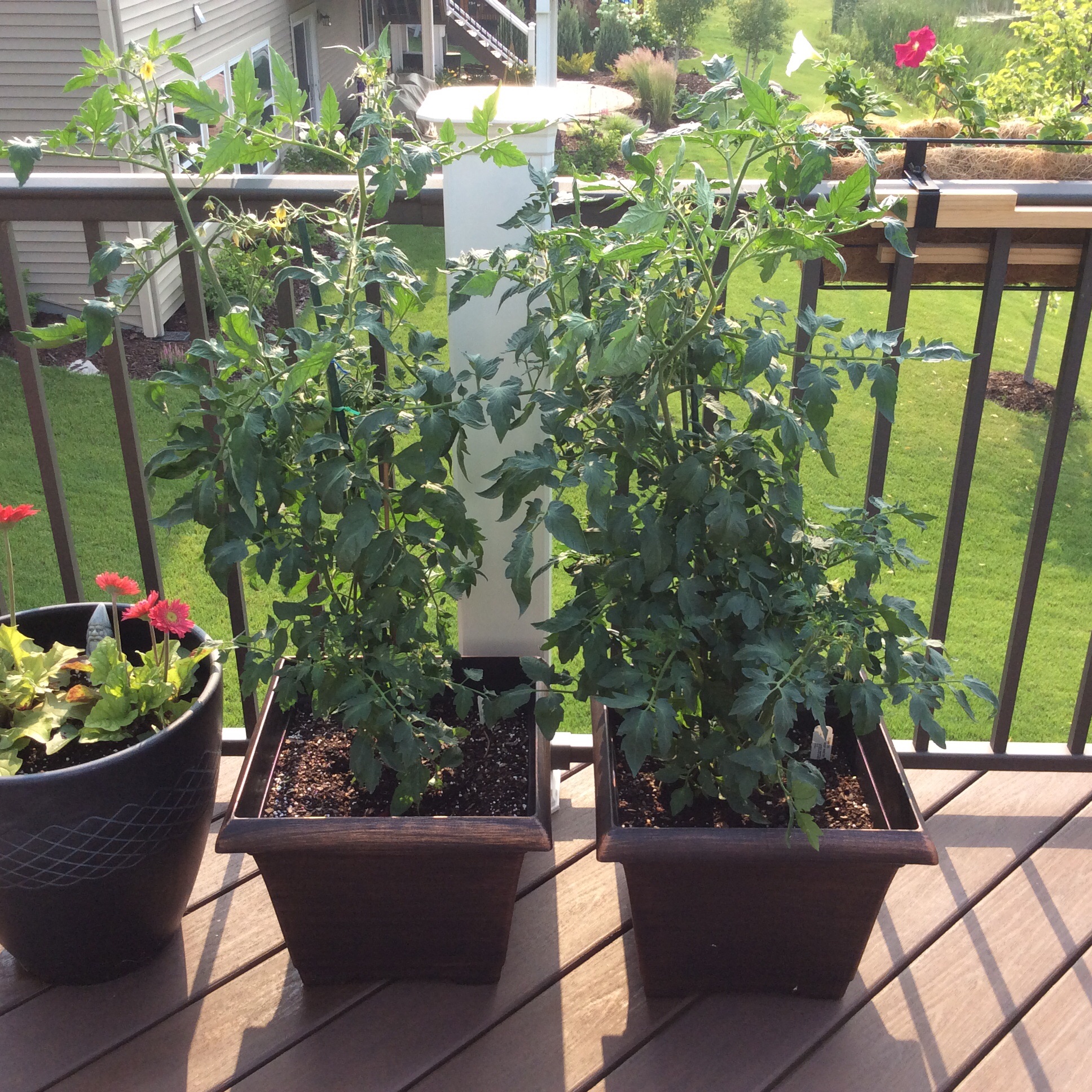 Ovan på bilden ses mina stora tomatplantor! Det är den till vänster som stoltserar med den första gröna tomaten. Hoppas förstås att de båda skall belöna mig med allt mitt vattnande och ompysslande, riktigt rikligt och ge oss en massa tomater!