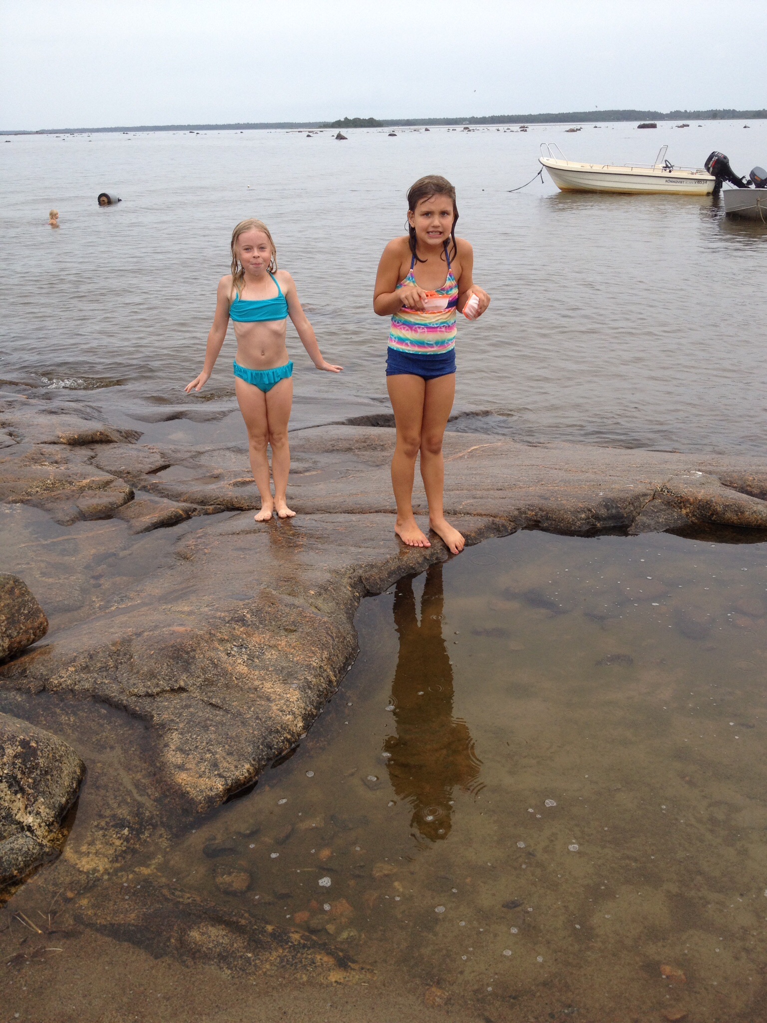 Lillasyster var nog lite tveksam över det här med simning, men kunde inte låta bli när kusinerna bestämde sig för att simma. Vad kallt det var!