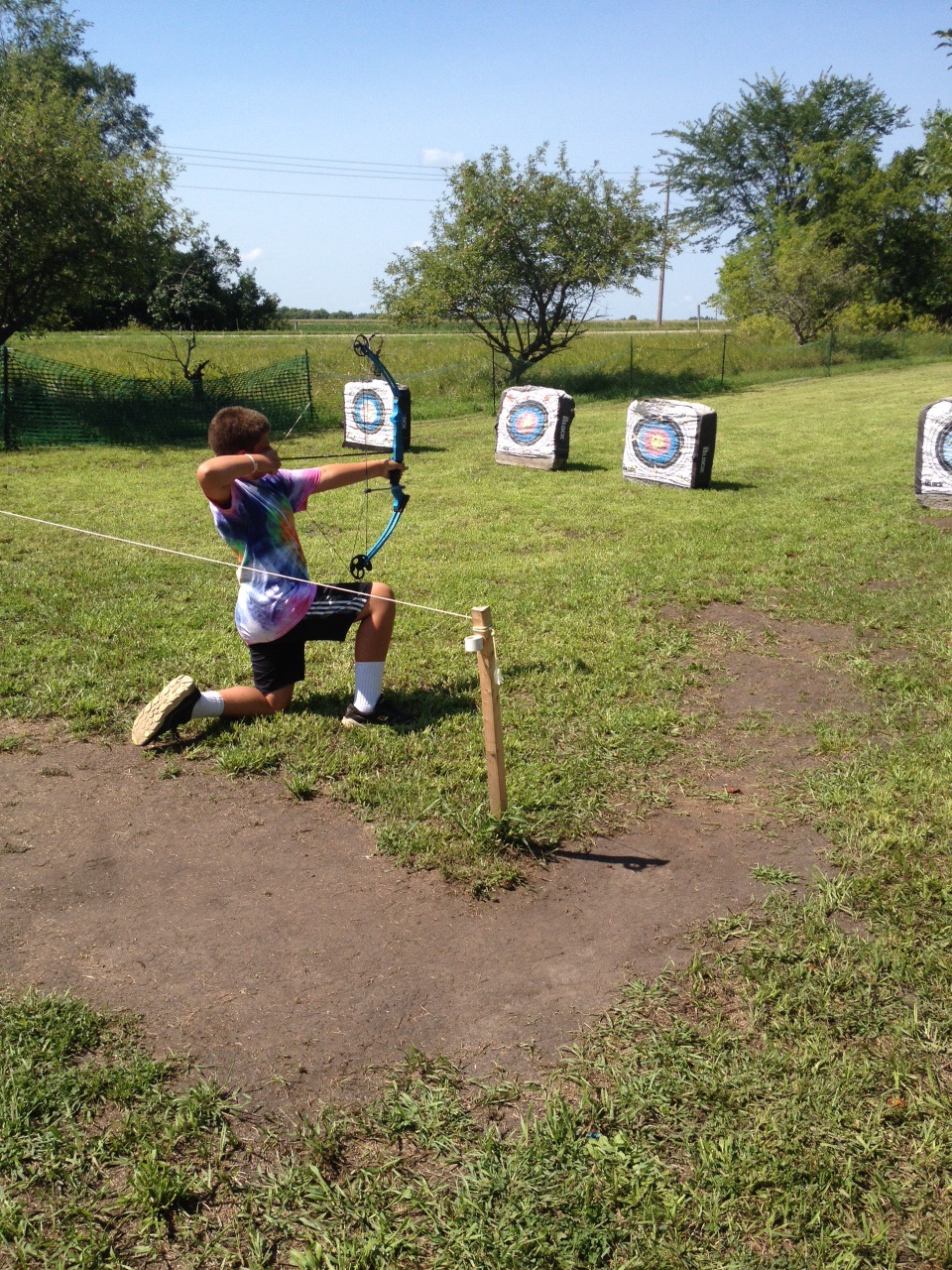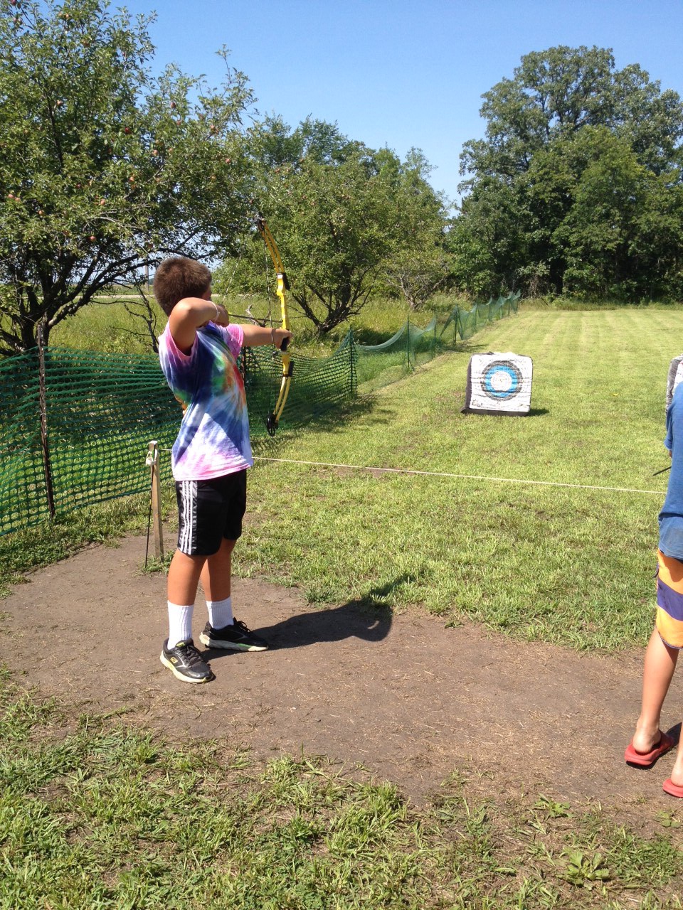 Sonen blev glatt överraskad när vi kom. Han hade ju trott att vi inte skulle komma. Han fick visa vad han hade lärt sig under de två veckorna denna sommar då han har lärt sig skjuta med pil och båge: