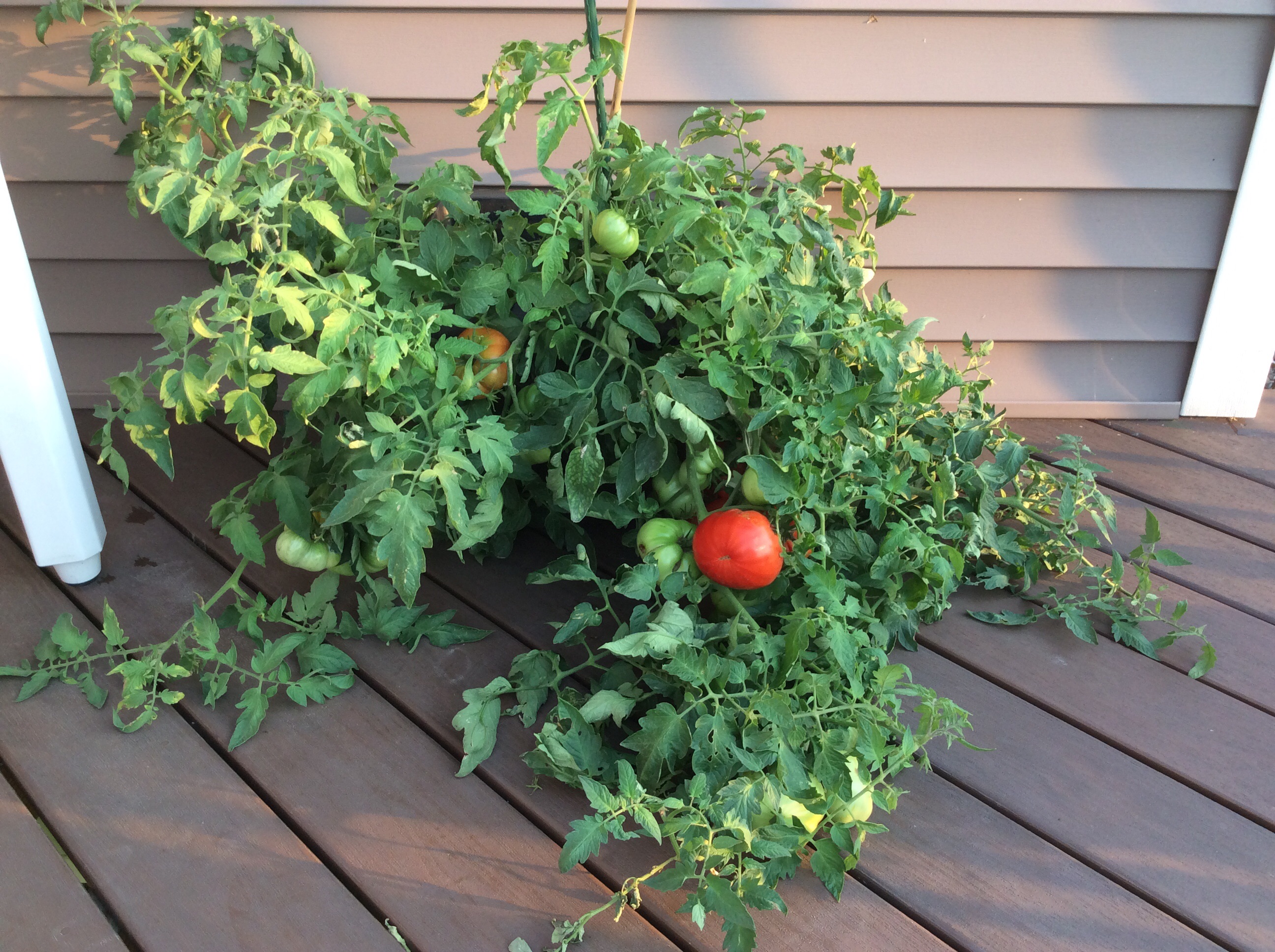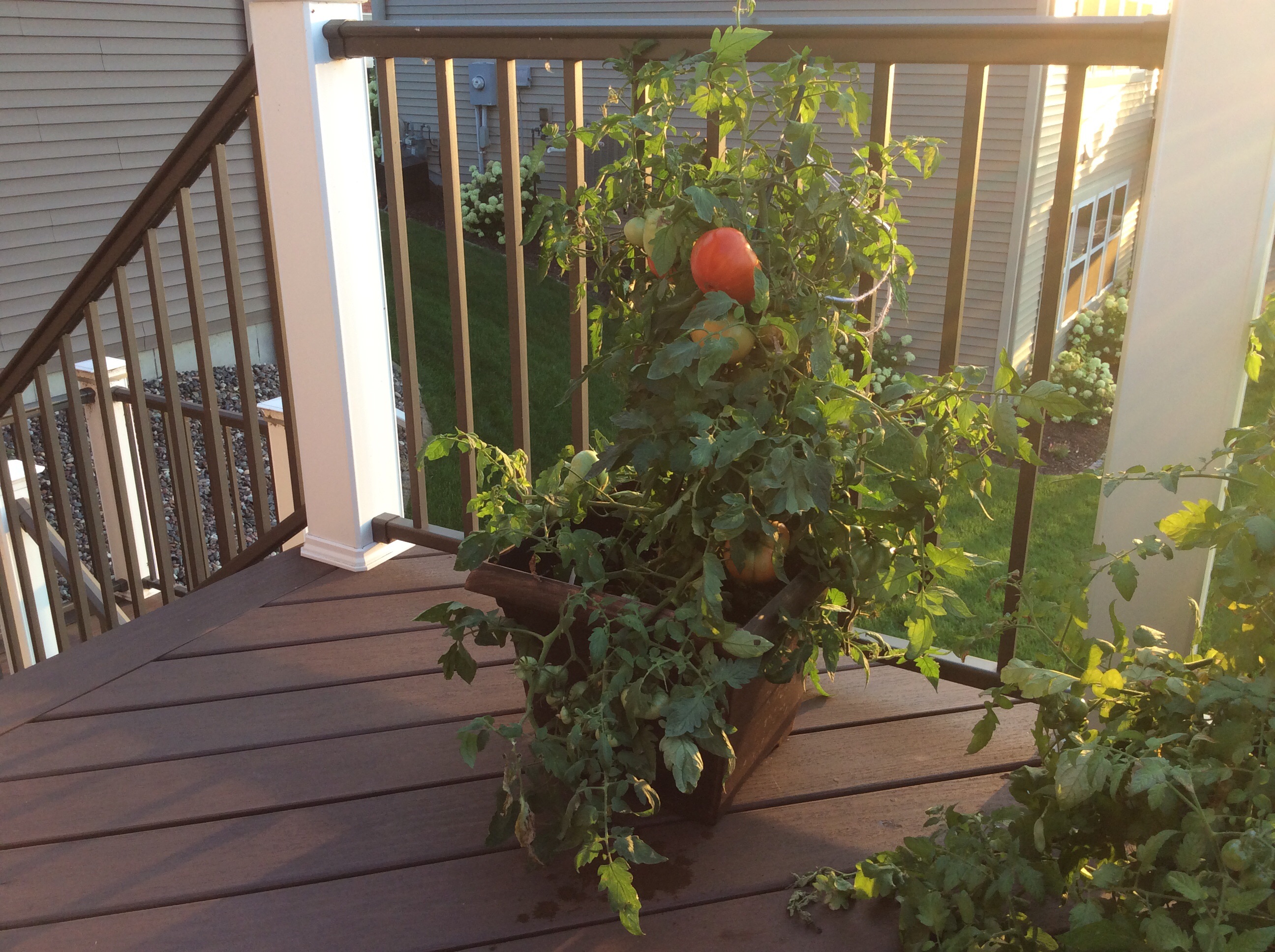 Först flyttade vi dem till Svärföräldrarnas för omskötsel innan vi åkte och sedan fyttade vi hem dem igen efter att vi kommit tillbka till Minneapolis. De har klarat sig förvånansvärt bra ändå. Jovisst, vi har förlorat några grenar här och några grenar där och några tomater har också fallit av. Men, men… Dessa tomater kämpar på och nu får vi skörda. Mums! Härligt gott med egan tomater! 🙂