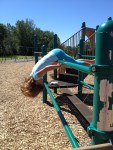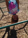 Eftersom vi hade kommit i god tid före utsatt tid, fick Lillasyster lite tid att leka på skolgården, som hon inte hade sett sedan i början på juni. Jag tror att detta smällde högst av allt! Det var roligt att träffa och läsa för Mrs. C, men det var änu roligare att få klättra och hänga upp och ner…! 🙂