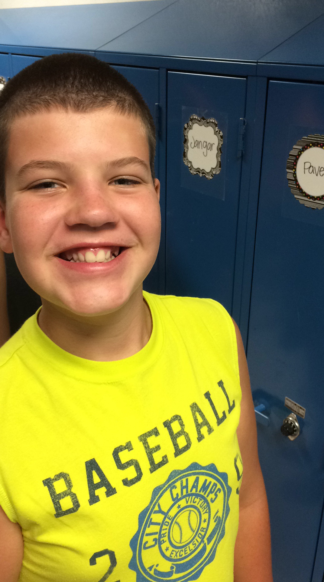 Ja verkligen! I skrivande stund befinner sig Maken och Sonen vid Sonens nya Mellanskola på öppet hus och s.k ‘locker move in‘. Detta innebär att Sonen har tagit med sig skolaväskan alldeles proppfull med häften, pennor o.dyl som vi inhanddlade förra veckan och skall ‘flytta in’ i sitt skåp. Bilden ovan skickade Maken åt mig för en stund sedan efter att de hittat Sonens skolskåp där han skall förvara sina grejor och springa till melln lektionerna. Fyra minuter har eleverna på sig mellan de 55 min långa lektionerna, så det gäller att inte söla precis.