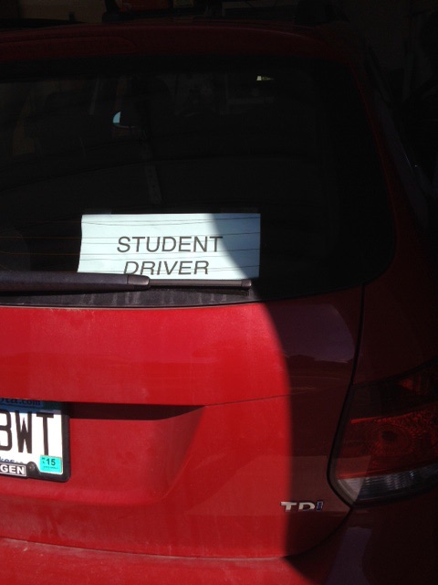 I bakfönstret på Makens bil tejpar vi upp skylten så att andra förare skall veta om att vi är ute och övningskör.