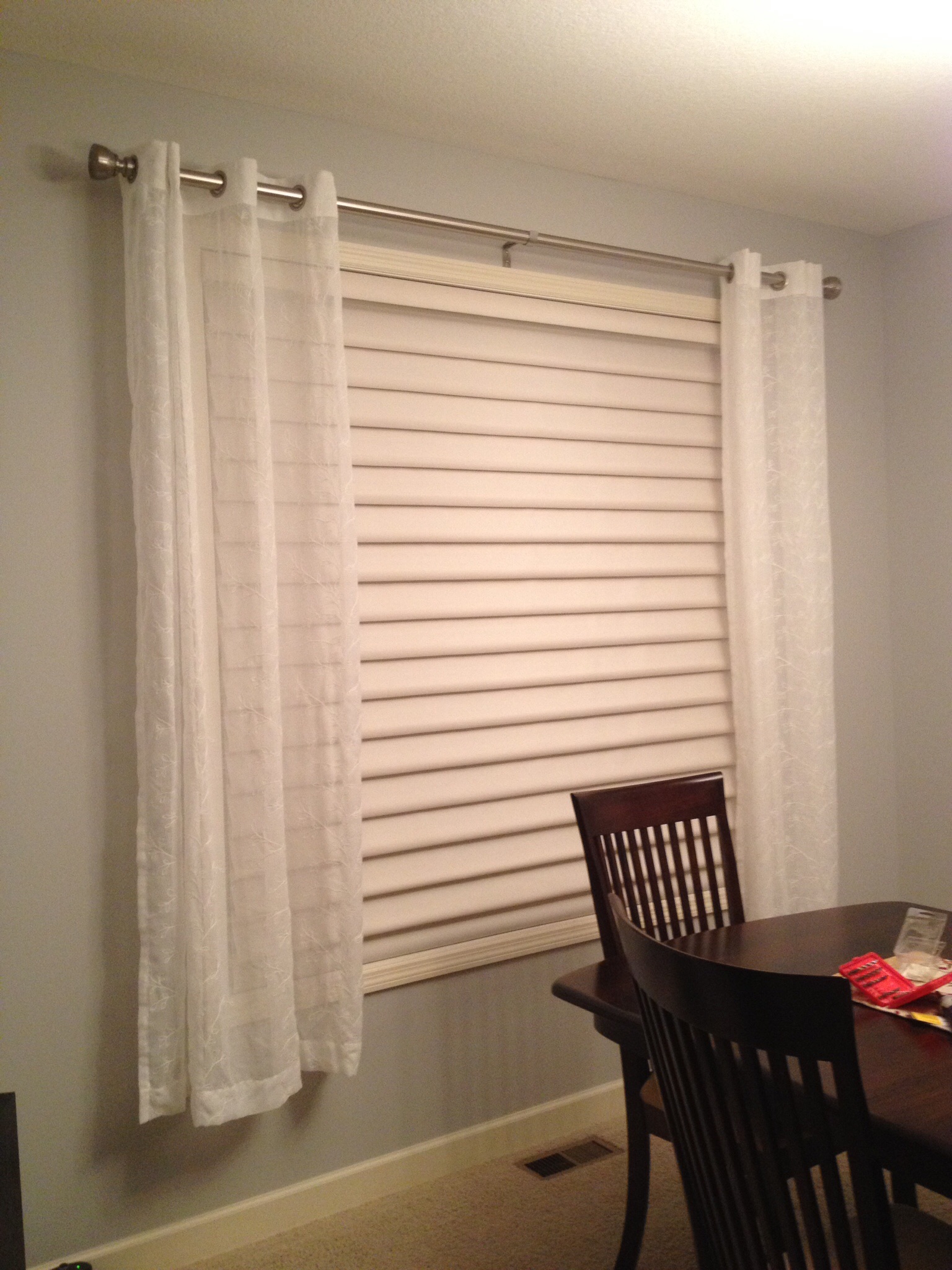 Fönstret i matsalen fick vita, skira gardiner med stjälkar och blad på.