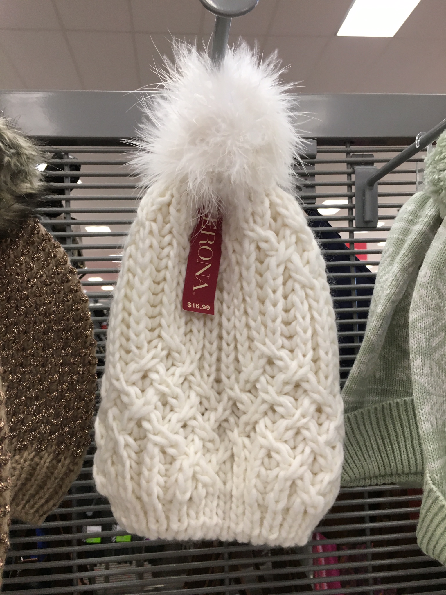 Inte hemstickad och med konstpäls, men annars en helt likadan mössa som var så populär för fyra år sedan där hemma. Jaaadå, visst är vi en aning efter här på andra sidan Potten! 😉