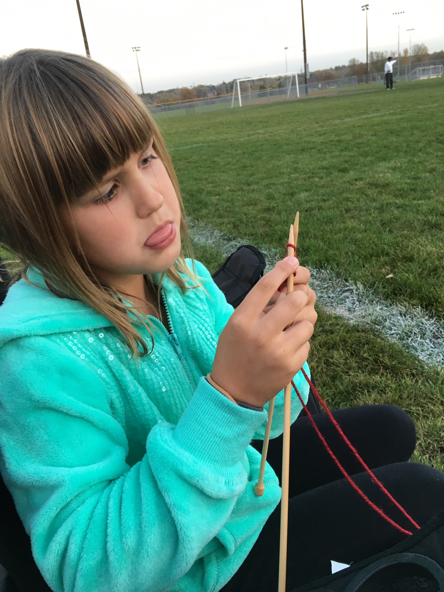 Medan Sonen sprang omkring ute på fotbollsplanen, blev det sticklektion vid sidan av och jag måste säga att det gick riktigt bra ändå. Jovisst, var det en hel del att hålla reda på och jämna blev ju maskorna inte, men någonstans skall man ju börja och Lillasyster tyckte att det var riktigt roligt att lära sig detta! Det slutade med att hon stickade tio maskor alldeles själv, men sedan blev det helt enkelt för mörkt för att kunna se stickningen särskilt bra. Vid det laget var det dags att packa ihop tälstolarna, fotbollen och ta med sig barnen hem i alla fall. Fotbollsträningen och sticklektionen var avslutade för den här gången.