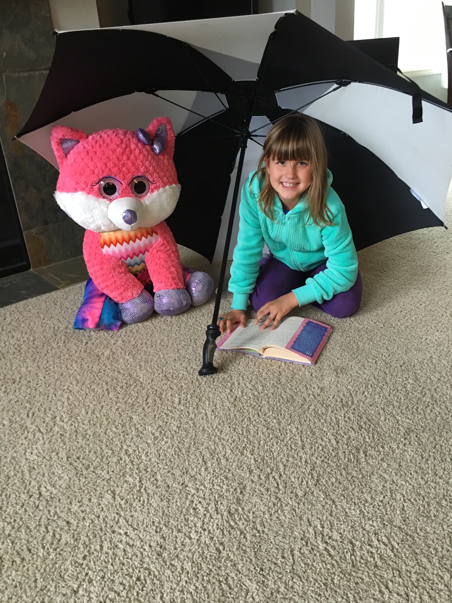 När läxorna skall läsas är det skönt med sin alldeles egna vrå under pappas jätteparaply och ett av favoritkramdjuren. Det tyckte Lillasyster efter att hon kommit hem från skolan idag. Rätt fifiigt egentligen! 😉
