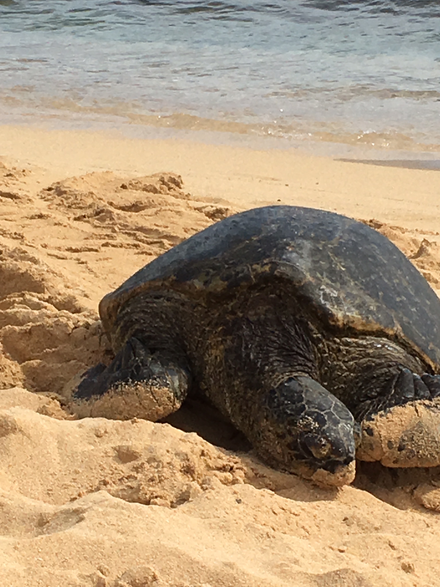 Efter att detta hade utspelats, kom en Hawaiian monk seal in till viken där vi simmade! Han hade redan länge legat och solat sig han också på en sanddyn lite längre bort, men fick nu tydligen för varmt och bestämde sig för att ta ett dopp. Nu kom mobilerna fram igen, fast den här gången var det vi som sprang efter sälen för att försöka få en bild. Maken sprang för vår del, men tyvärr hann han inte fånga den brungråa sälen på bild innan den simmade ut ur viken.