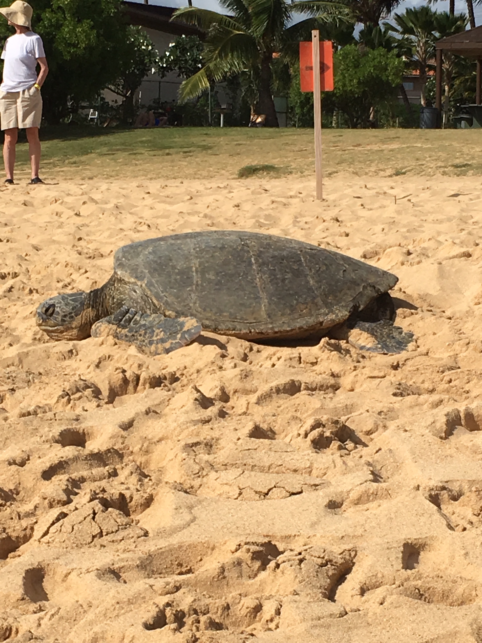 Please stay away from the turtle at least 15 feet! ( 5 m ), varpå vi alla backade en aning, men säkert inte tillräckligt långt från denna jättelika sköldpadda, som inte verkade nämnvärt störas av alla mänskor och kameror och uppståndelse i största allmänhet.