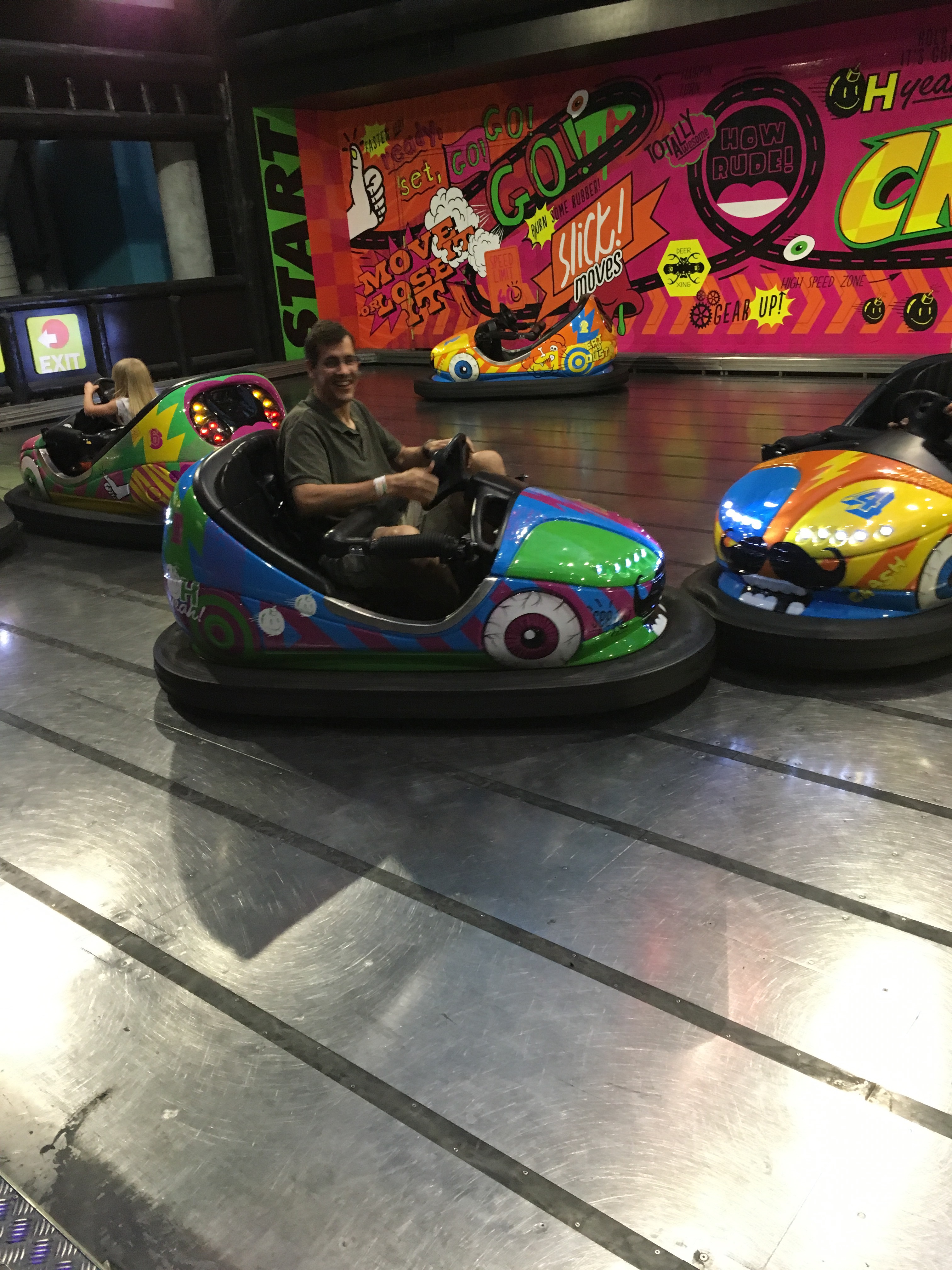 Även vuxna måste få ha lite roligt ibland! Här provar Maken på krockbilar.