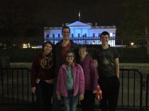 Klockan hann bli hela 22.30 innan vi var tillbaka vid hotellet. Här tog en av våra medresenärer på rundturen på kvällen en bild av hela familjen framför Vita Huset, som egentligen hette the Executive Mansion, när det först byggdes. Presidenten John Adams var den fösta presidenten med familj att bo där. Det finns fem våningar, 132 rum, 440 dörrar, 8 trappor och nej, vi fick inte gå in. Det behöver man ha speciellt tillstånd till och det hade inte vi. Mera om Vita Huset i ett senare inlägg….