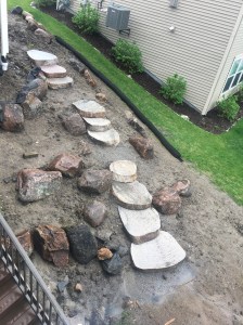 Trots veckans ihärdiga regnande, lyckades arbetarna komma och göra färdigt trapporna som leder från garaget ner till bakgården. Jag lyckades ta denna bild emellan regnskurarna efter att jag kommit hem från jobbet, men allt annat arbete står stilla. Ett tag regnade det så hårt att det gick inte ens att ta foton genom fönstret!