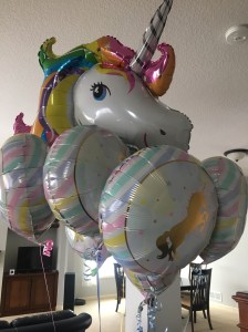 Ballongbuketten med enhörningar. Den största ballongen går till Lillasyster och sedan får alla gästerna ta hem en ballong på var….