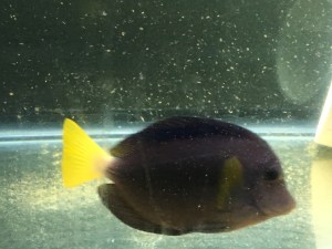 Ja, Flo är Makens senaste fisk som han köpt. Vet inte ens vad rasen heter på svenska, men på engelska är det en ‘purple tang’. Samma släkte som fisken Doris, i Nemo filmerna.