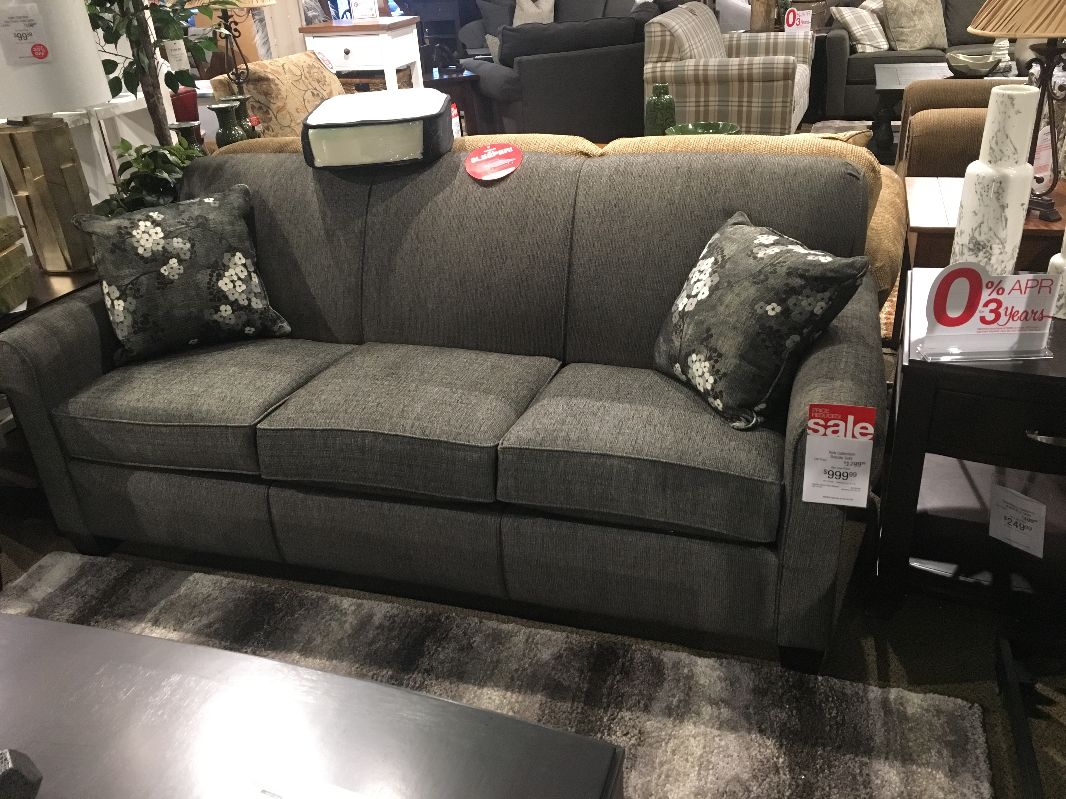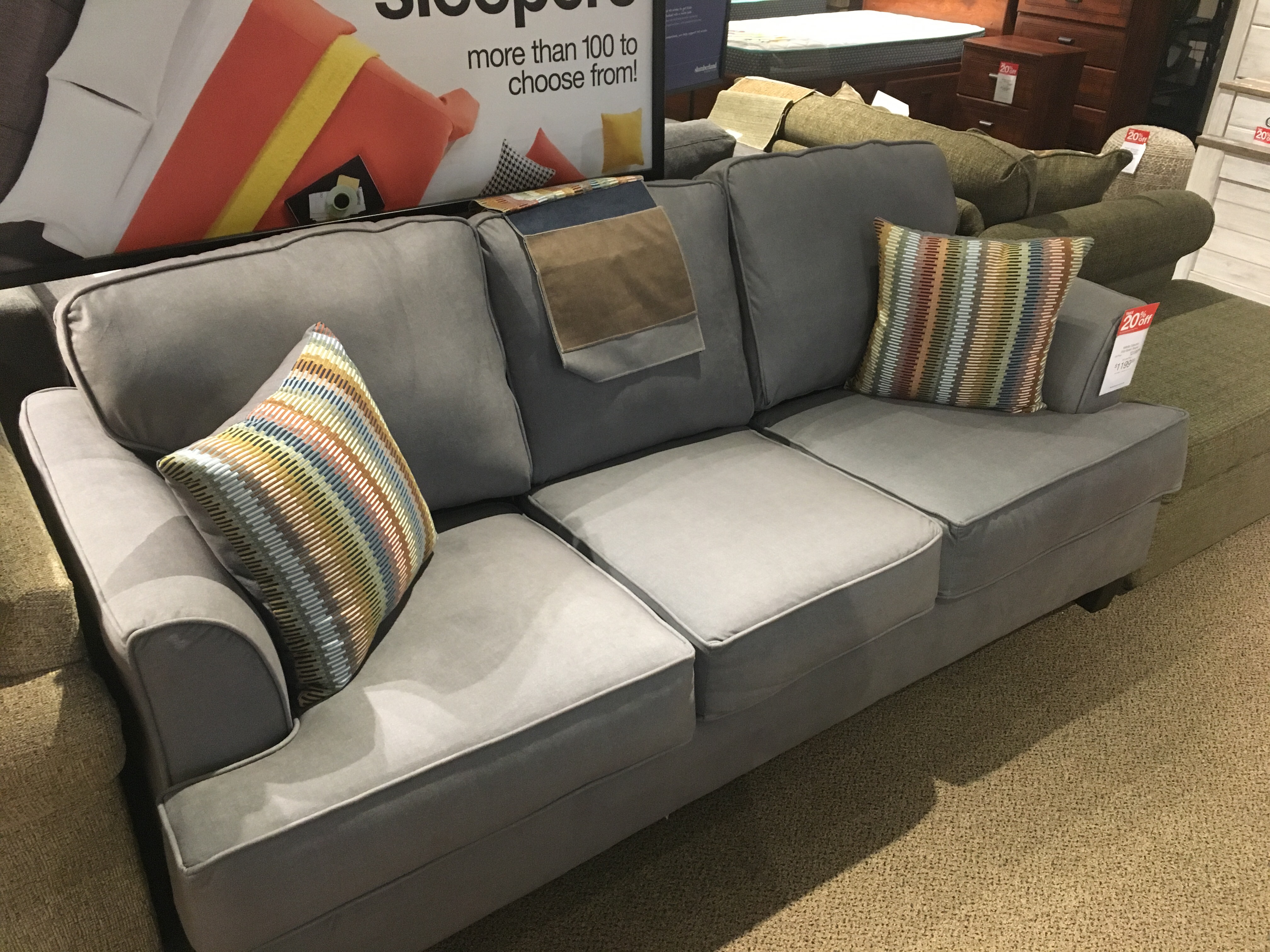 Vi valde soffan på den nedersta bilden, men inte i grått, utan i en ljusare, brun/beige färg. Soffan är bäddbar, men inte för stor och bökig.