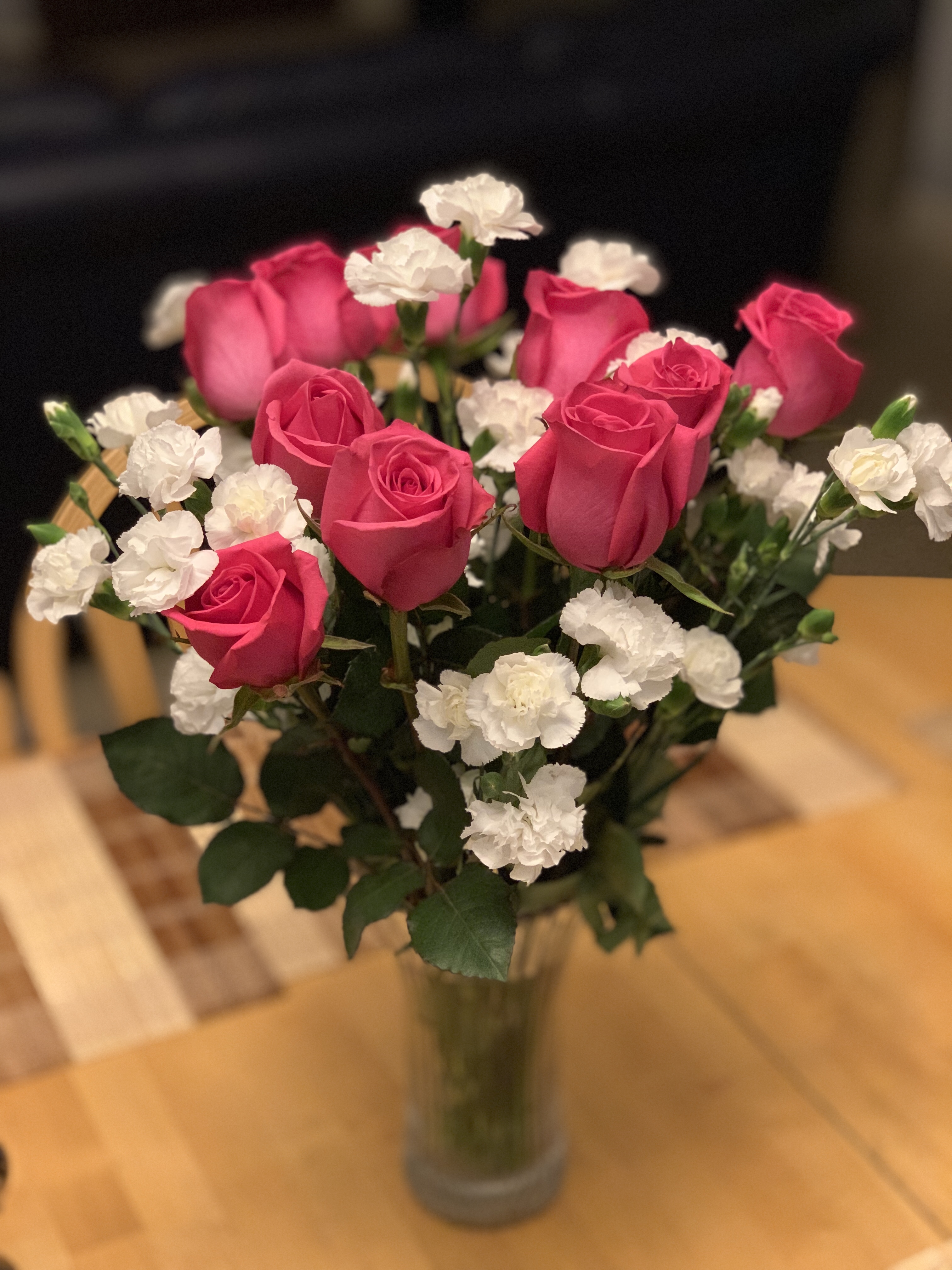 Är de inte vackra? Blommorna som jag kom hem till igår efter jobbet! Den där Maken… Han vet vilka blomster jag tycker om. Dessa rosor doftar helt underbart på köksbordet och sprider glädje.