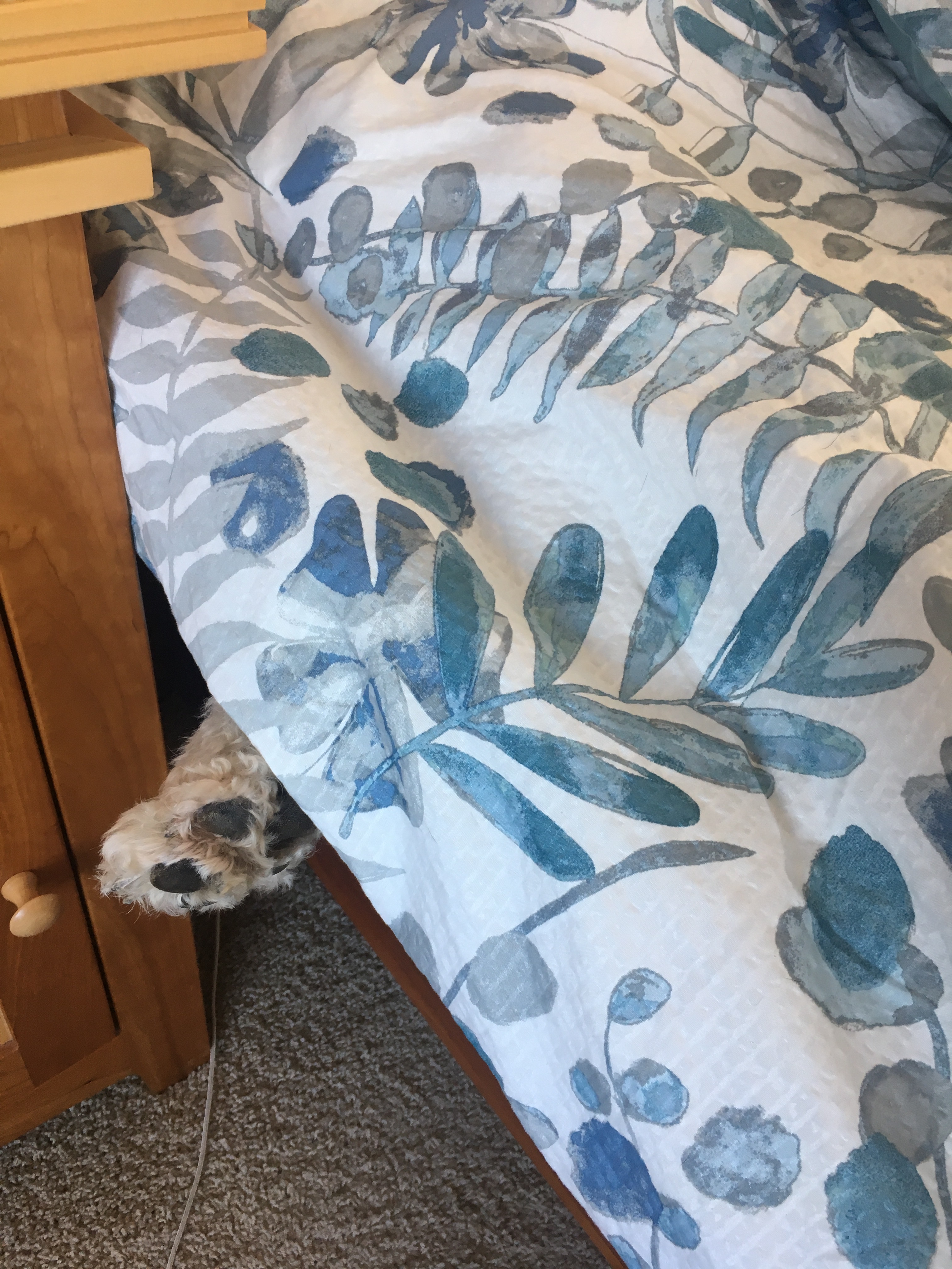 … hittade jag denna tass när jag skulle bädda imorse. Ett gott skratt fick jag, eftersom hunden Lilly låg så tyst och sov så gott att hon inte ens märkte Mattes förehavanden. Jag drog täcket bakåt lite och ut tittade en förvånad och väldigt sömning hund och hon ville inte alls stiga upp, så att jag kunde bädda färdigt.