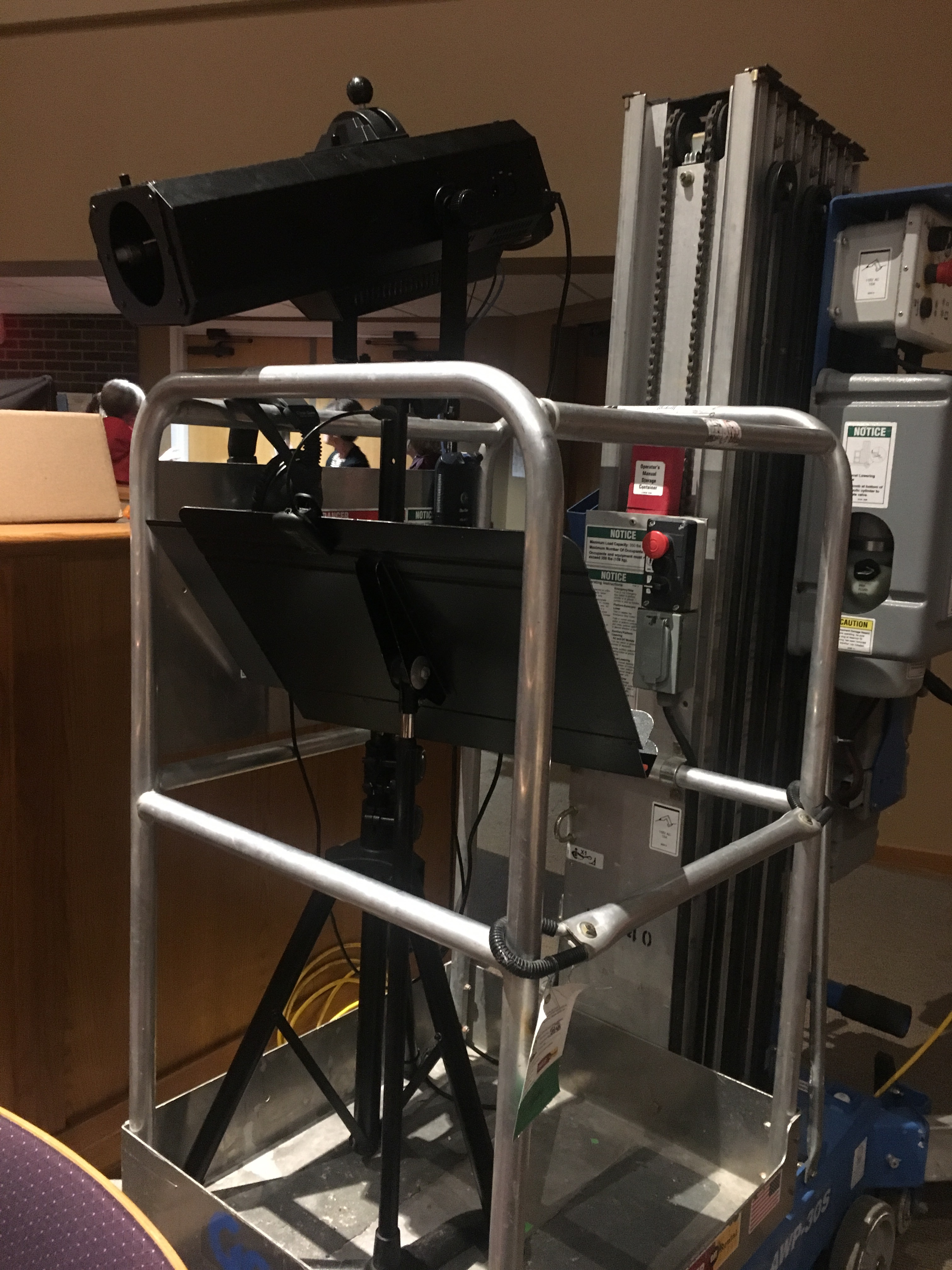 I denna makapär åker han nästan ända upp till taket med sin strålkastare och skiner den enligt manuskriptet på skådespelarna under hela den två och en halv timme långa pjäsen.