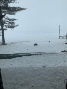 Då Maken har på besök till stugan för två veckor sedan var sjön alldeles inhöljd i den otroligt täta dimman… ( till höger syns lite av den metallställning som utgör den, för vintern, uppdragna bryggan, och mitt i bilden syns eldstaden.)