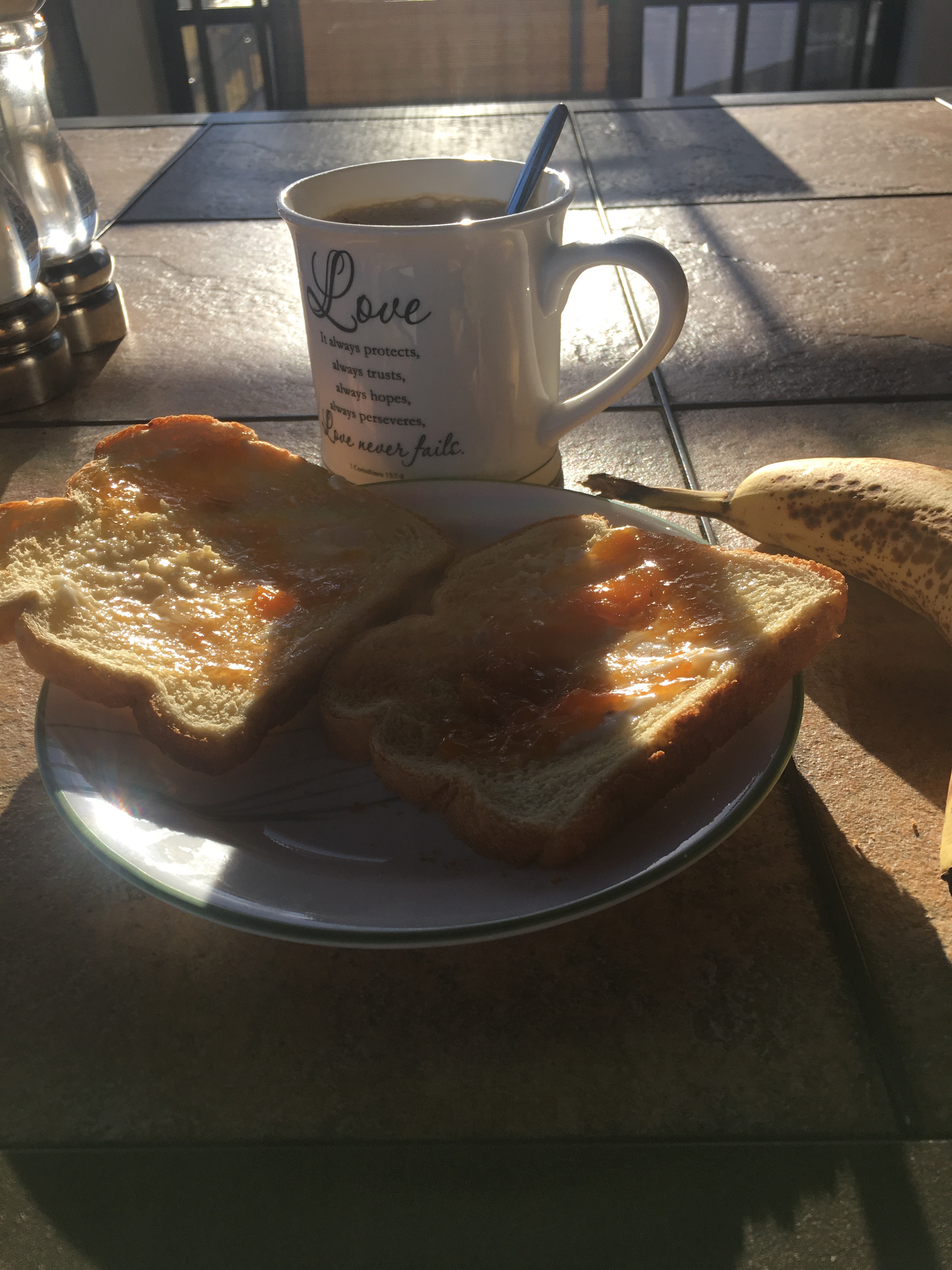 Med den allra första frukosten intagen ute på verandan i solen! Visserligen är fönstren uppe ännu och det var rätt kyligt då jag kom hit ut för en stund sedan men… åh….. Ljuvliga vår! Du är så välkommen med ditt fågelkvitter, ösregn i dagarna två och nu bjuder du på sol och värme och gräset grönskar nu när det fått vatten.