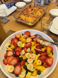 Efetrsom skinkpaj är ( i vanliga fall) morgonmat på den här sidan Potten, rörde jag till en fruktsallad bestående av skuren mango, jordgubbar, blåbär och bananer och till denna severade jag också vaniljyoughurt tillsammans med skinkpajen. För de kaffedrickande såg Maken till att det fanns nybryggt, hett kaffe och alla åt och lät sig väl smaka.
