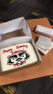 Bucky Badger, skolans maskot som är en grävling, pryder tårtan.