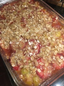 Den fösta skörden var dock väldigt rik och jag plockade tio stjälkar för att göra en god efterrätt på rabarber och jordgubbar, Ovanpå detta sätts sedan en blandning av havregryn, farinscoker, smör och kanel och sedan skall allt in i ugnen.