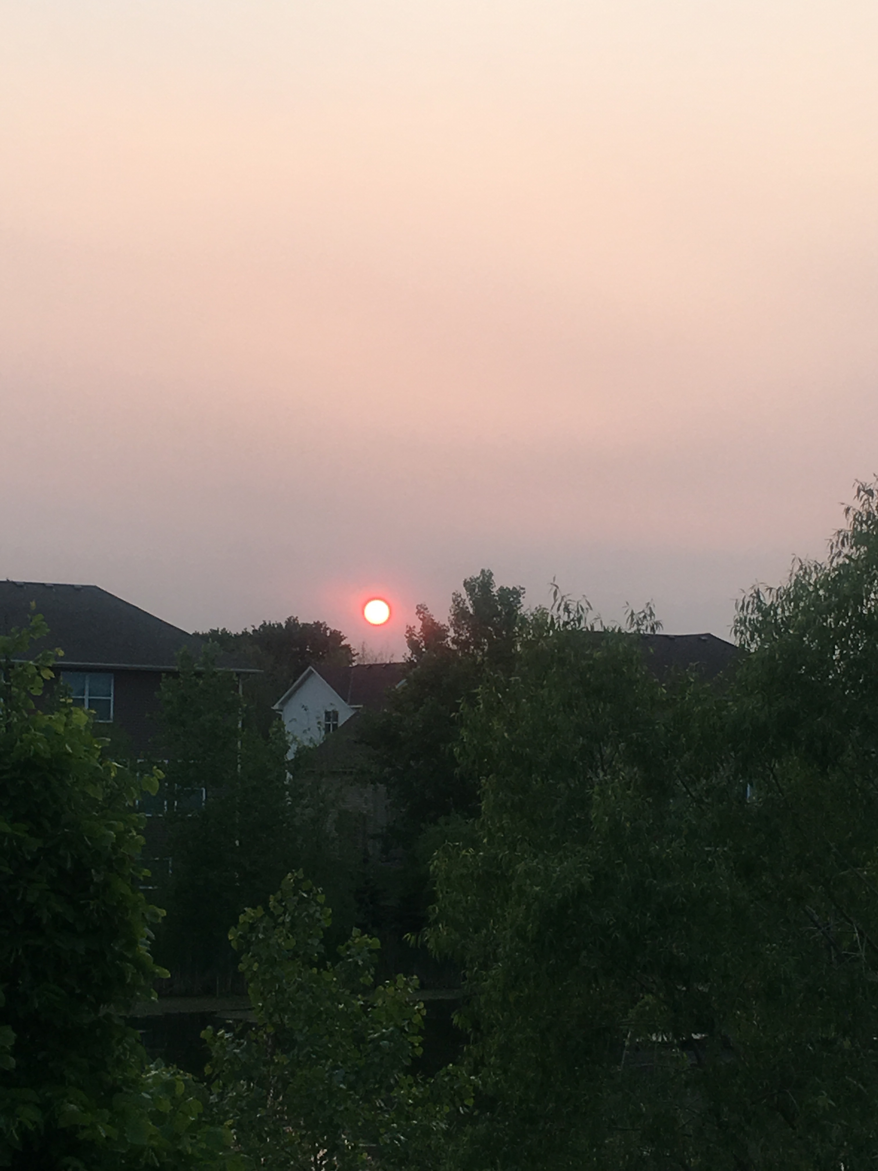 Solen just innan nedgången ikväll. Redan, fast det är så tidigt i säsongen, härjar skogsbränder i grannlandet Kanada och atmosfären ovanför Minnesota ( som angränsar till Kanada. Tvillingstäderna ligger ungefär 500 km från den kanadensiska gränsen i norr.) har påverkats hela helgen. Varningarna om dålig luft i städerna har förekommit de senaste 3-4 dagarna och som sagt, solen stiger upp röd på morgonen och ser likadan ut igen på kvällarna. Mitt på dagen lyser den genom ett nästan dimlikt täcke.