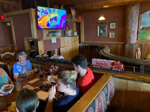 … att vi åker till restaurangen där den beställda maten kommer levererad på modelltågbana bredvid bordet! Jag trodde lite att vi skulle kunna skippa detta besök det här året eftersom Sonen vid 15 års ålder verkligen inte är lika tågtokig som han var som fyraåring, men redan i början av semesterveckan bad han att få åka till denna restaurang. Så denna fredagskväll, den sista under vår semstervecka här i Wisconsin Dells, åkte vi dit.