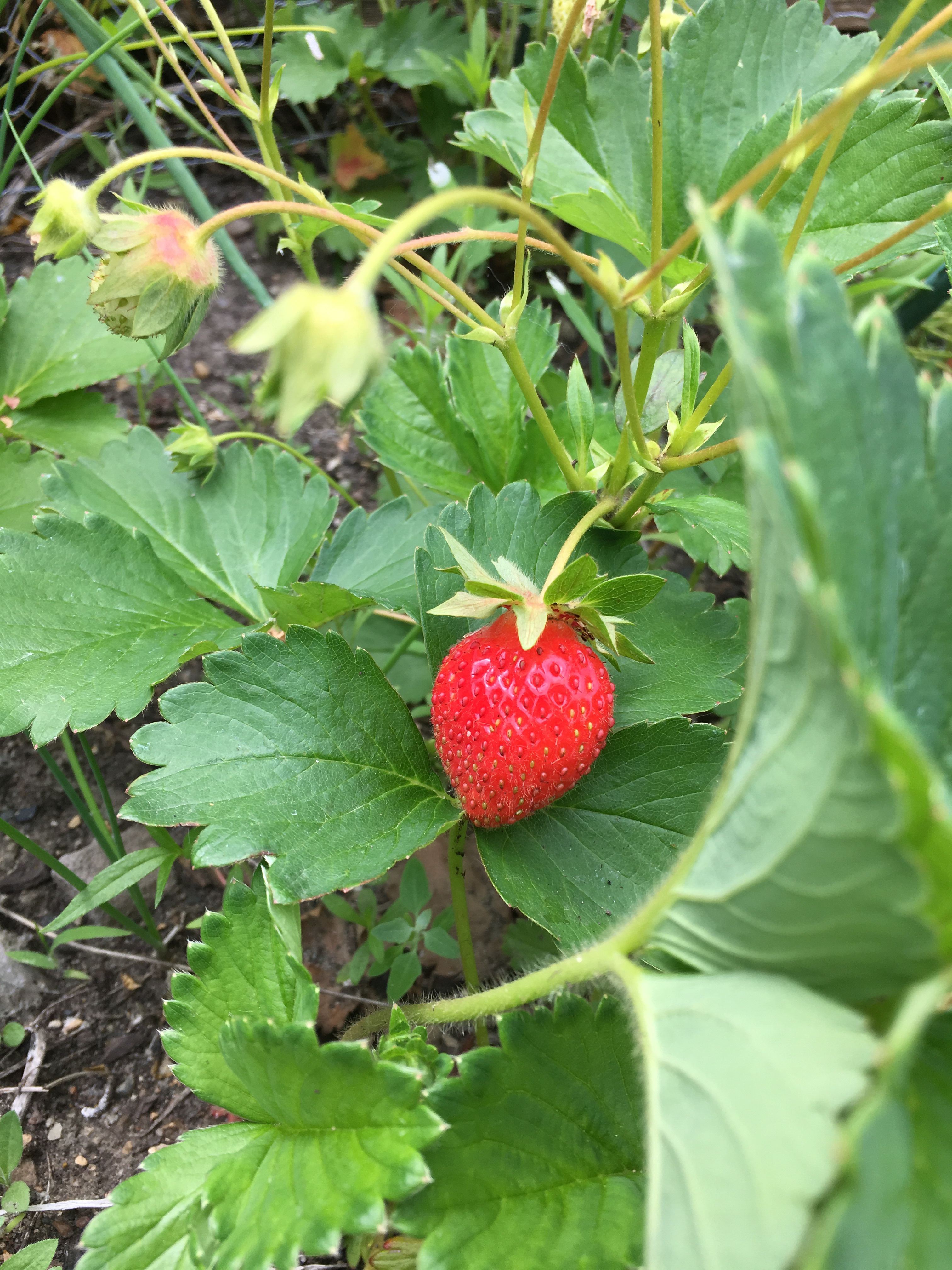 Tillbringade en halv timme ute i trädgårdslandet och rensade ogräs denna eftermiddag, innan regnskurarna började hopa sig. De allra första jordgubbarna tittar nu fram under bladen på jordgubbsplantorna och precis som de två tidigare åren är de små, men mycket söta till smaken.