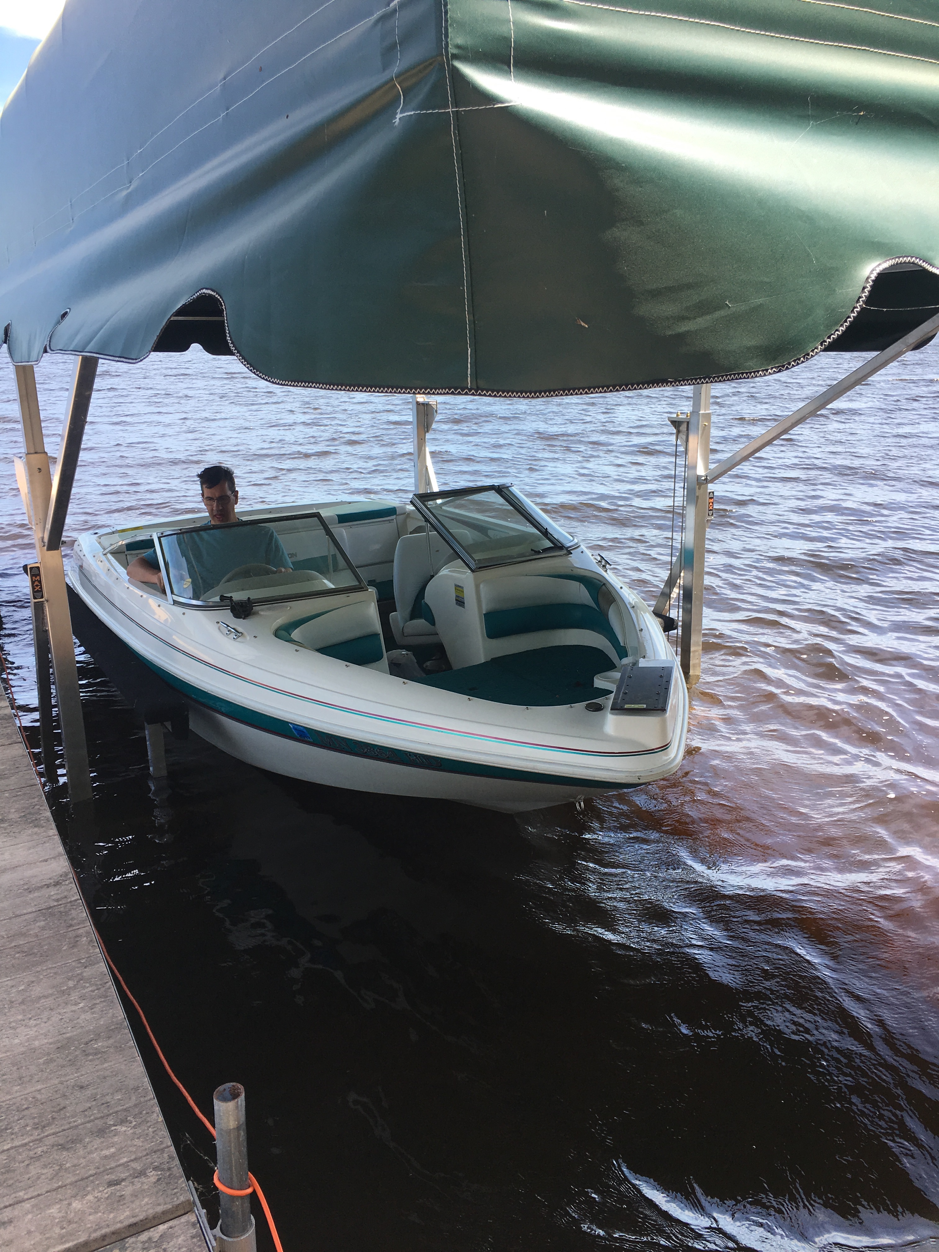 Nu skulle båten permiärprovas! Och det var säkert intressant för grannarna att se på när två landkrabbor som Maken och mig skulle lära oss använda detta nya båtgarage. Det tog lite testande hit ch dit, men till slut fick Maken koll på läget och båten nervinschad i vattnet. Vi klättrade ner i den och backade ut. Det gick lite trögt i början, men väldigt snabbt fick Maken koll på läget och motorn och iväg åkte vi!