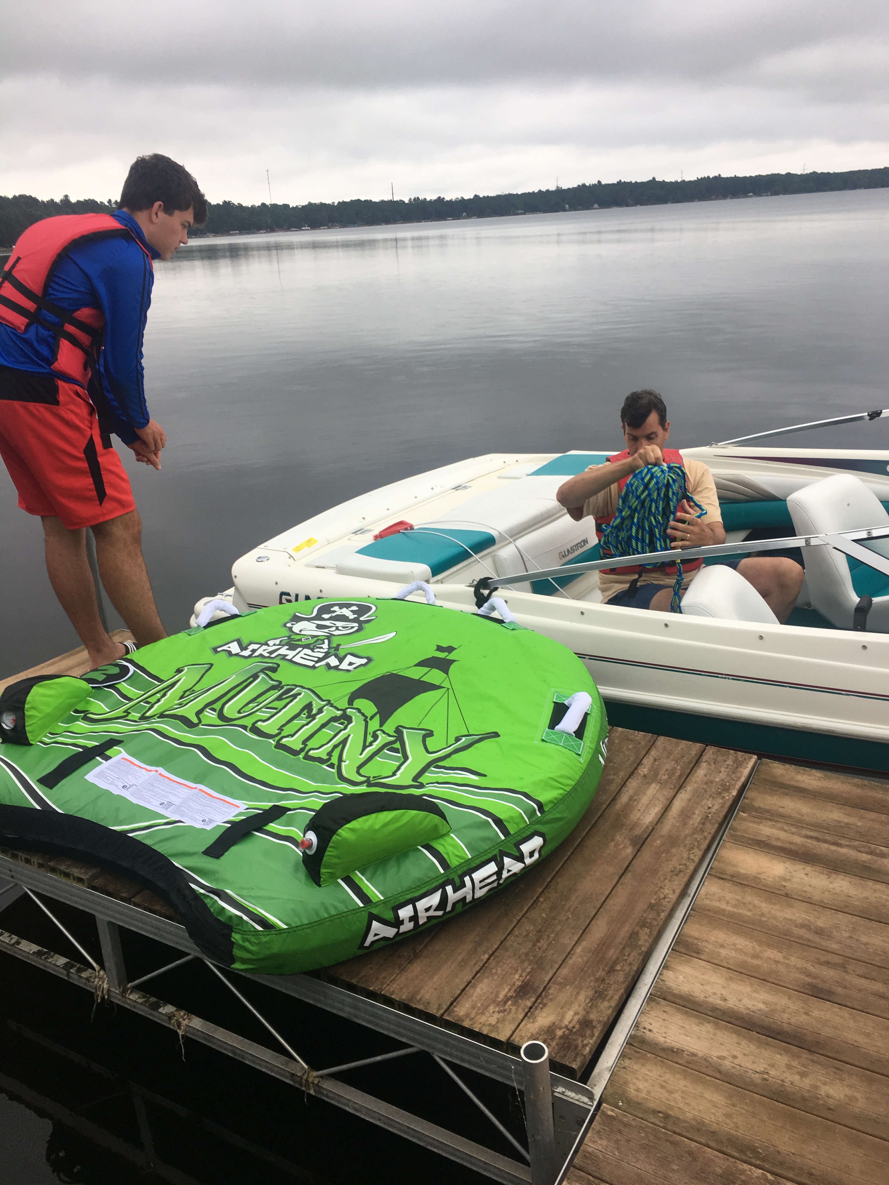 På bilden ovan ses denna gröna madrass som dras efter båten. Precis som vattenskidor, men man ligger på den istället för att stå på den. ( tube kallas de på engelska. Det hela började nämligen med att man låg på innerdäck som drogs bakom båten.)