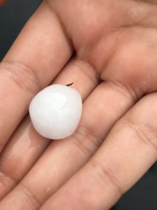 Ovan håller hon ett av haglen som föll under den korta, men intensiva stormen.