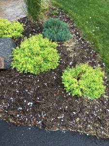 Hagel ligger utspridda bland buskarna på framsidan av vårt hem.