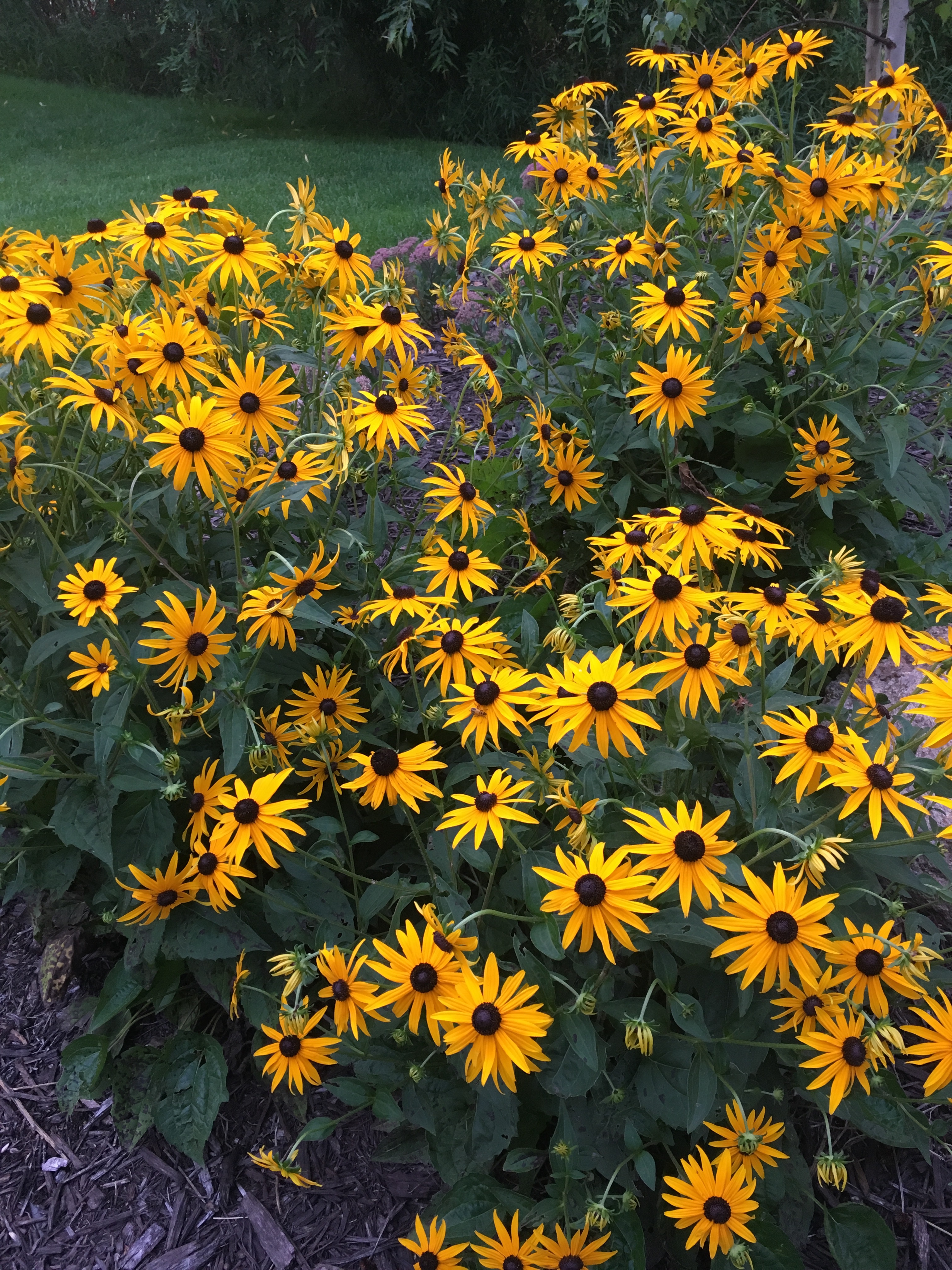 Och blommorna och växterna visar ju också tecken på höst förstås. Dessa  ‘black eyed Susans‘ blommor planterades för två år sedan och mår förträffligt bra. De blommar under augusti månad och idag när det var så mörkt och mulet ute, sken de verkligen upp sitt lilla hörn på baksidan av vårt hem.