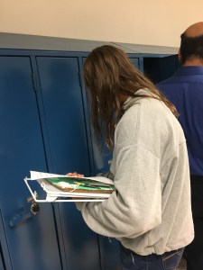 Lillasyster hittade sitt skåp och kunde prova sin nya kod för låset på skåpet. Det var inte så lätt, men efter att ha prövat flera gånger fick hon det upplåst och öppnat.