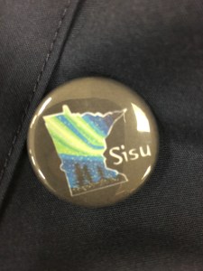 Idag då jag anlände till jobbet fanns det ett vitt kuvert på min hylla där jag förvarar min väska. Inne i kuvertet fanns denna lilla knapp att sätta på mig. Den föreställer kartan av Minnesota, täckt i skog och norrsken och sedan ser ni ju vad som står till höger. Min arbetskamrat som hade hittat den lilla knappen åt mig att pryda min arbetsväst med tyckte att jag behövde ha en sådan. Den representerar mina båda världar, som hon uttryckte sig. Och det stämde ju, så det var var bara att sätta fast den och med stolthet bära omkring lite sisu på jobbet då.