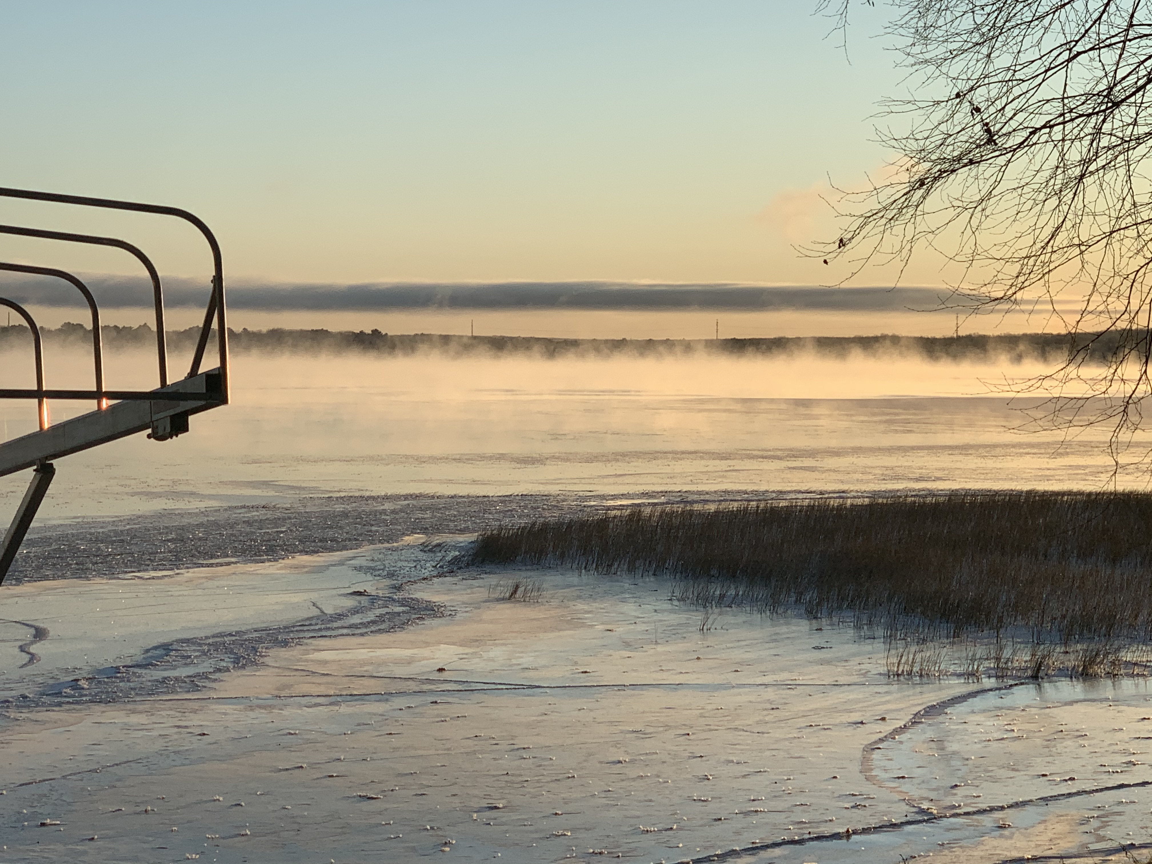 Detta foto fascinerade Svärfar ngt enormt. Han både fascinerades av det och hade samtidigt svårt att tolka bilden. Dimman som stiger upp från isen gjorde att han trodde att molnbanken ovanför skogshorisonten var skogen. Han funderade varför vi hade köpt stuga vid ett sådant litet dike?